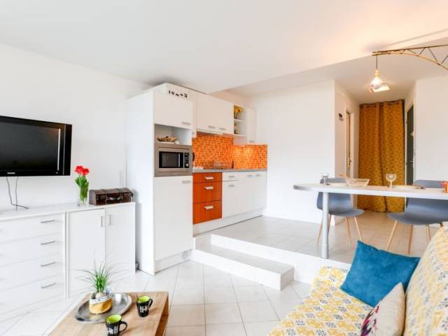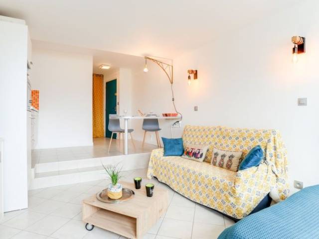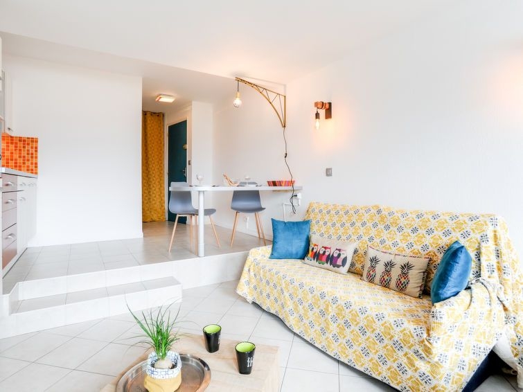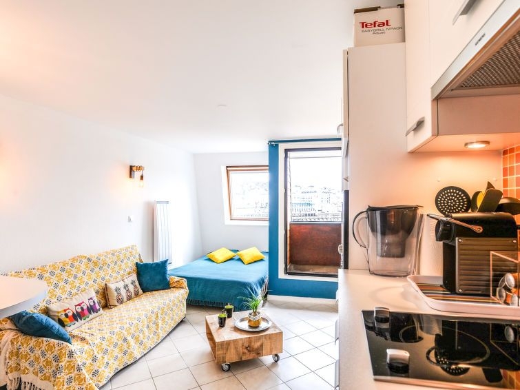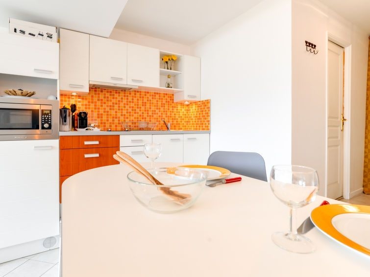 Deauville: Residencia "Les Marinas". En el barrio de Port Deauville, a 800 m del centro, a 500 m del mar, a 500 m de la playa. En el complejo: ascensor, sala para guardar bicicleta. (20 escalones). Posibilidad de aparcamiento. Tienda, tienda de comestibles 650 m, supermercado 950 m, restaurante 650 m, parada de autobús 400 m, estación de tren "Deauville-Trouville" 1.2 km, piscina cubierta 1.1 km, piscina termal "Deauville" 1.1 km. Campo de golf 4.1 km, tenis, centro ecuestre 750 m. Atracciones en los alrededores: Centre International Deauville - CID 900 m, Hippodrome Deauville-La Touques 1.3 km, Mémorial de Caen 55 km, Plage du débarquement d'Arromanches 87 km. A tener en cuenta: la entrega de llaves se realiza por la agencia Interhome en Deauville. Se pueden reservar alojamientos adicionales. Estudio 25 m2 en el 5° piso, orientación este. Luminoso, completamente reformado, con mobiliario bonito y moderno: entrada. Salón-comedor con 1 sofá-cama doble (1 x 140 cm, 190 cm de longitud), TV (pantalla plana), radio. Salida al balcón. Rincón-cocina (2 Placas de inducción, tostadora, hervidor de agua eléctrico, cafetera eléctrica, microondas/grill). Ducha/WC. Calefacción eléctrica. Balcón 1 m2. Muebles de balcón. Vista panorámica muy bonita al mar y al paisaje. El alojamiento dispone de: Internet (Wifi, gratis). A tener en cuenta: apartamento para no fumadores. Detector de humo. 14220 000106 OZ