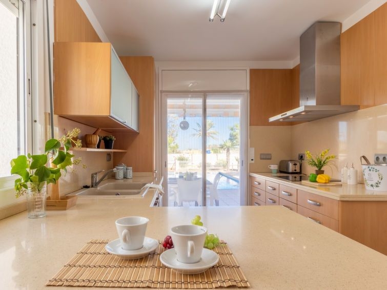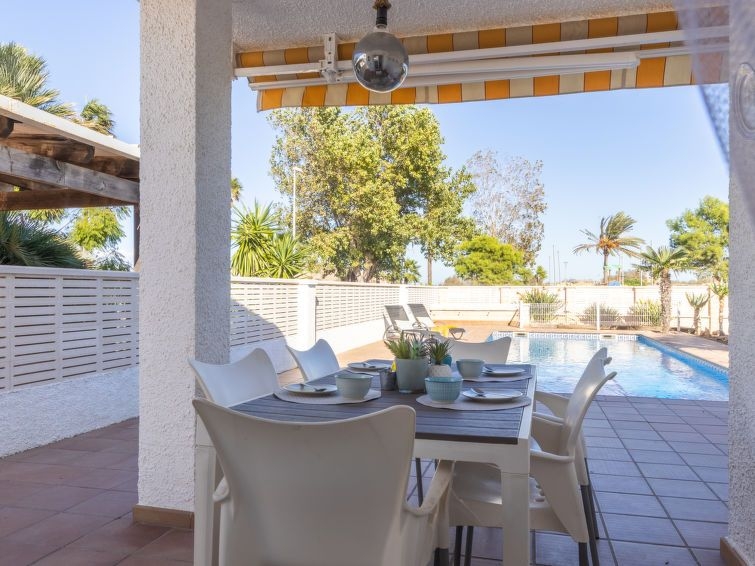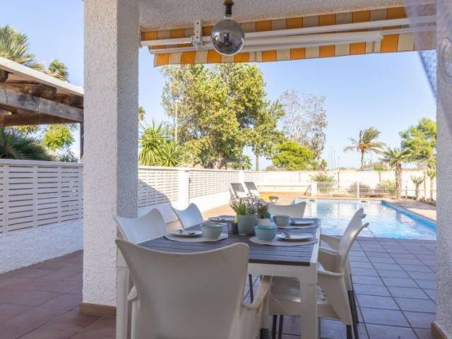 Urb. Riumar a 8 km de Deltebre: Casa "Silvia", muy bonita, confortable, individual. Lugar tranquilo, soleado area residencial (villas), a 20 m del mar, a 20 m de la playa. Privado: jardín bonito, cuidado, piscina rectangular (7 x 4 m, Disponible por temporada: 01.Ene. - 31.Dic.) con escalera interior. Ducha exterior, muebles de jardín, barbacoa, aparcamiento en el mismo terreno. Tienda de comestibles 200 m, supermercado 8 km, restaurante, bar 200 m. Grupos de jóvenes sólo bajo petición.