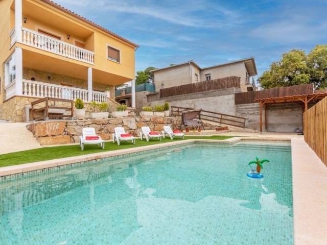 Casa "Armonia", muy agradable, confortable de 2 plantas del año 2004. En la periferia, a 4 km del centro de Maçanet de la Selva, lugar tranquilo, soleado, a 2 km de un bosque, a 20 km del mar, a 20 km de la playa. Comunitario: parque. Tenis (extra), básquet, parque infantil (tobogán, columpio). Privado: terreno 800 m2 (vallada), bonito jardín para relajarse, piscina rectangular (9 x 3 m, 27 m2, 80 - 170 cm de profundidad, Disponible por temporada: 01.Jun. - 30.Oct.) con sistema de limpieza por electrolysis de sal. Ducha exterior, porche (12 m2), aparcamiento (para 2 coches) junto a la casa. Tienda 4 km, tienda de comestibles 500 m, supermercado 4 km, centro comercial 32 km, restaurante 4 km, bar 400 m, panadería 500 m, estación de tren "Massanet-Massanes" 4 km. Caminos para bicicletas, parque infantil 500 m. Atracciones en los alrededores: Marinland 21 km, Tossa de mar 32 km, Waterworld 21 km, Pista Atletismo 500 m, Espais Girona Centro comercial 30 km, Campo de futbol 500 m. A tener en cuenta: adecuado para familias. El propietario no acepta grupos de adolescentes/jóvenes. Carga y descarga de equipaje posible en la casa de vacaciones. Vecindario muy sensible a ruidos. Se ruega respetar la tranquilidad y normas de buen comportamiento. "Armonia", casa 5 estancias 180 m2. Espacioso, con mobiliario muy funcional: 2 dorm. dobles, cada habitación con 1 cama de matrimonio (150 cm, 190 cm de longitud). 1 dorm. doble con 2 camas (90 cm, 190 cm de longitud), TV digital. 1 dorm. doble con 1 cama de matrimonio (150 cm, 190 cm de longitud). Salida a la terraza. Baño/bidet/WC. Ningún tipo de calefacción. En planta inferior: salón-comedor con TV digital. Cocina abierta (horno, 4 placas de vitrocerámica, tostadora, hervidor de agua eléctrico, microondas, congelador, cafetera eléctrica). Salida a la terraza-jardín, a la piscina. Ducha/WC. Muebles de terraza, barbacoa, tumbonas. Vista a las montañas y a la localidad. El alojamiento dispone de: lavadora, plancha, trona, cuna hasta 2 años, secador de pelo. Internet (Wifi, gratis). A tener en cuenta: 1 mascota / perro. TV solamente ES. HUTG-068147