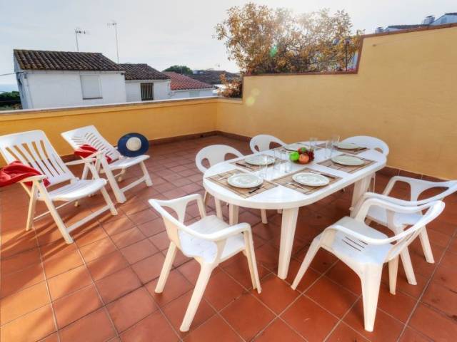 "Aria", casa adosada 5 estancias 110 m2. Con mobiliario sencillo y agradable: salón-comedor con mesa de comedor y TV digital. Salida a la terraza. Cocina (4 fogones, horno, microondas, congelador, cafetera eléctrica). WC separado. Ningún tipo de calefacción. Planta superior: 1 dorm. doble con 1 cama de matrimonio (135 cm, 190 cm de longitud). Salida a la terraza. 1 dorm. doble con 1 cama de matrimonio (135 cm, 119 cm de longitud). 1 dorm. con 1 cama (90 cm, 190 cm de longitud). Baño/WC. Planta superior 2: 1 dorm. con 3 camas (90 cm, 190 cm de longitud). Salida a la terraza. Muebles de terraza. Vista parcial al mar. El alojamiento dispone de: lavadora, plancha, trona, cuna hasta 2 años, secador de pelo. Internet (Wifi, gratis). Adecuado para familias. 1 mascota / perro. HUTG006314