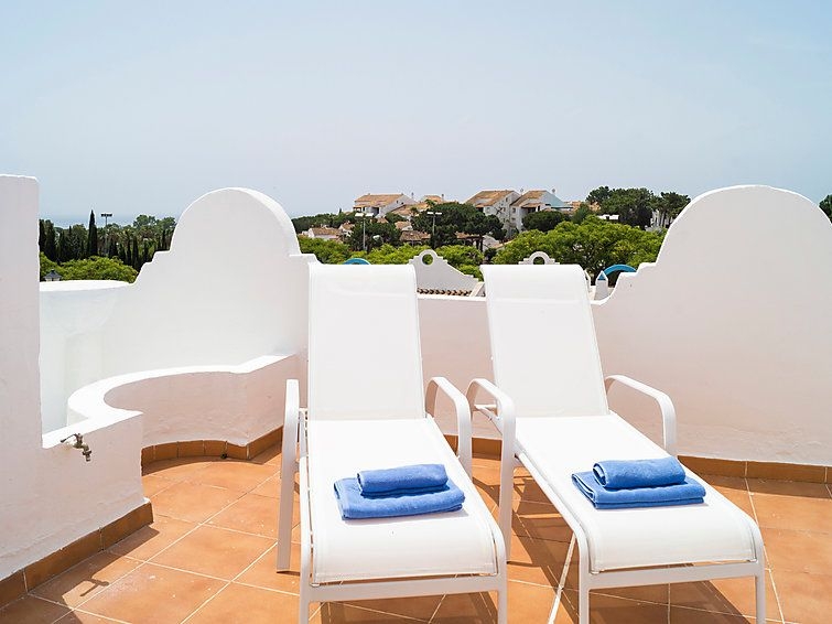 "Reserva de Marbella", vivienda adosada 3 estancias 70 m2 en 2 plantas, orientación sur. Vivienda adecuada para 4 adultos. Con mobiliario sencillo y de buen gusto: salón-comedor con 1 sofá-cama, TV digital, calefacción eléctrica y aire acondicionado. Salida a la terraza. 1 dorm. con 1 cama de matrimonio (140 cm, 190 cm de longitud), ducha/WC. Cocina abierta (horno, 4 placas de vitrocerámica, tostadora, hervidor de agua eléctrico, microondas, cafetera eléctrica) con mesa de comedor. Planta superior: 1 dorm. con 1 cama de matrimonio (160 cm, 190 cm de longitud), ducha/WC, TV y aire acondicionado. Salida a la terraza. Muebles de terraza. Vista muy bonita al paisaje. El alojamiento dispone de: lavadora, plancha, trona, cuna, secador de pelo. Internet (Wifi, gratis). A tener en cuenta: casa para no fumadores. 1 mascota / perro. VFT/MA/05738