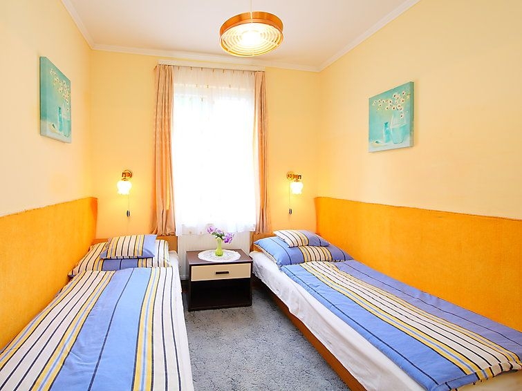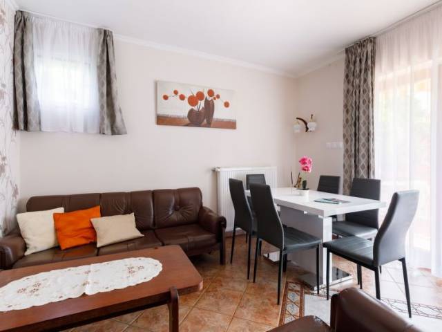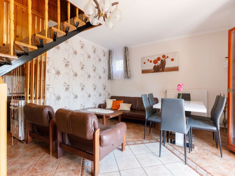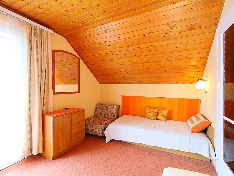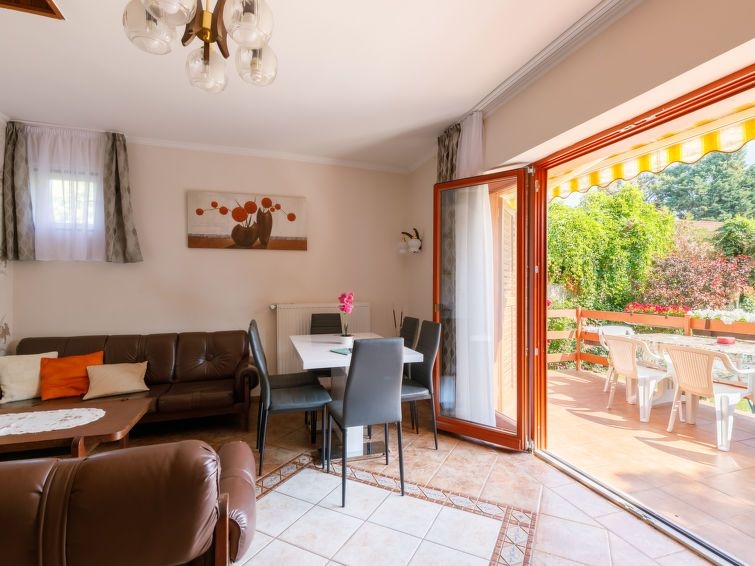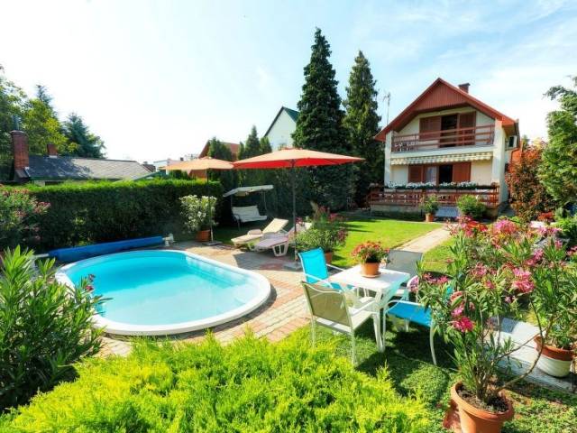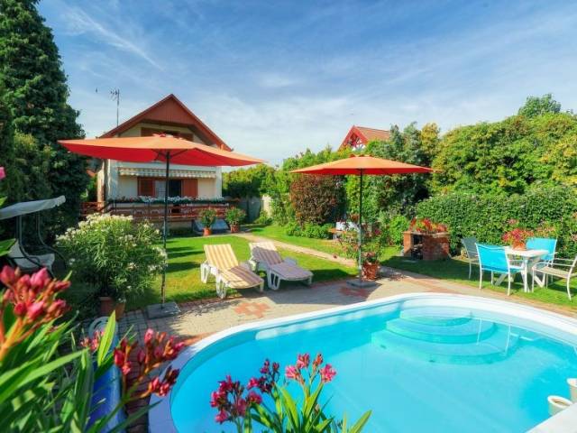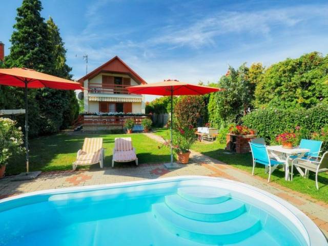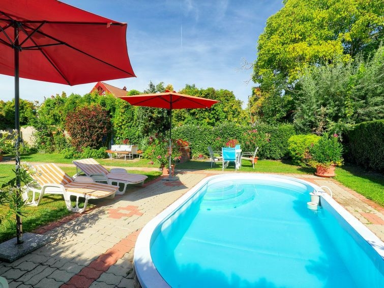 Balatonalmádi: Casa "Flamingo", bonita. En la localidad, a 500 m del centro, a 200 m de un lago, a 500 m de la playa. Privado: jardín (vallado), terreno con hierba, piscina en forma de riñon (13 m2, 120 cm de profundidad, Disponible por temporada: 01.Jun. - 20.Sep.). Lugar para hoguera. En el inmueble: Wifi. A disposición: bicicletas (4). Tienda de comestibles 1 km, restaurante 600 m, piscina cubierta 4 km. A tener en cuenta: vías del tren en la proximidad.