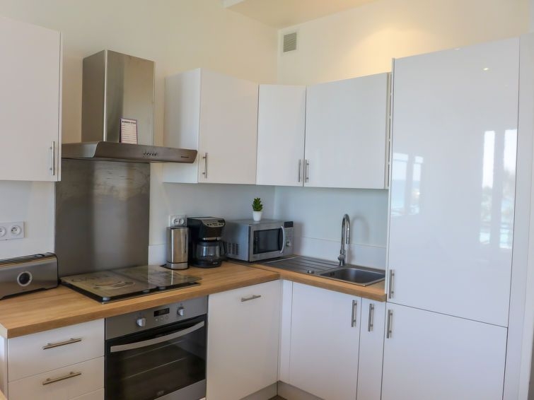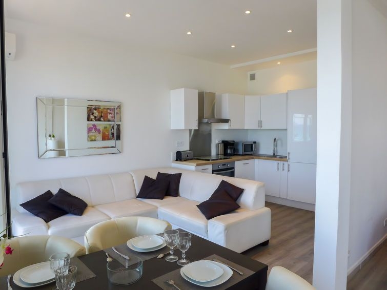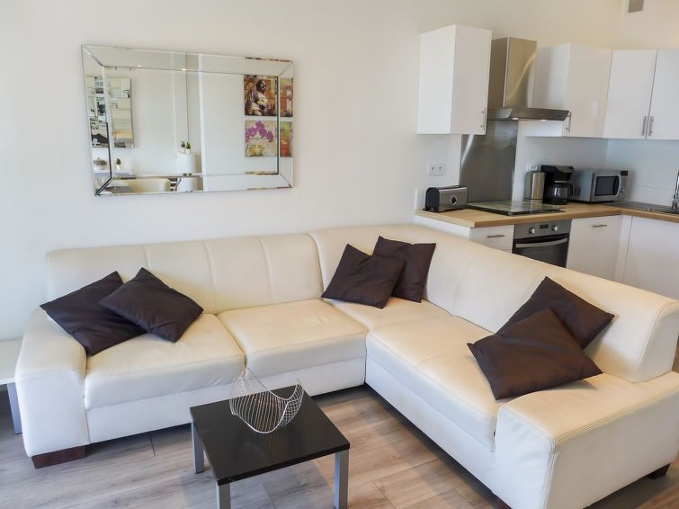 Estudio 40 m2 en el 2° piso, orientación sur. Espacioso y luminoso, reformado, con mobiliario bonito y moderno: salón-comedor con 1 cama de matrimonio (1 x 140 cm, 190 cm de longitud), TV y canales internacionales (pantalla plana), aire acondicionado. Salida a la terraza. Cocina abierta (horno, lavavajillas, 4 Placas de inducción, microondas, congelador, cafetera eléctrica). Ducha/WC. Calefacción, aire acondicionado. Suelo de parquet. Terraza 7 m2, orientación sur. Muebles de terraza. Vista panorámica espléndida al mar. El alojamiento dispone de: lavadora, secadora, plancha, secador de pelo. Internet (Wifi, gratis). A tener en cuenta: 1 mascota / perro. Detector de humo. 06088009340HT