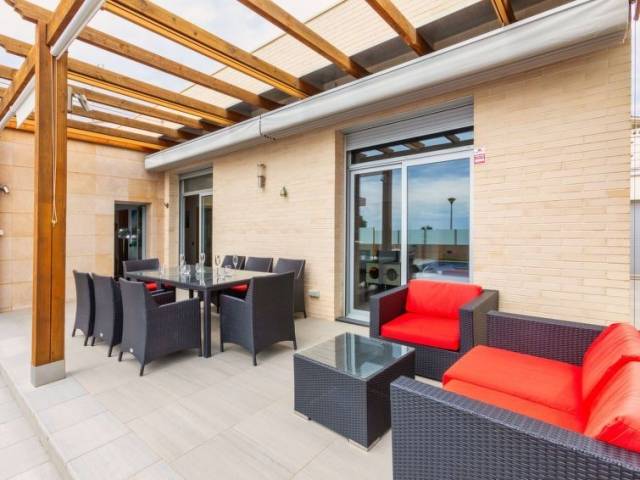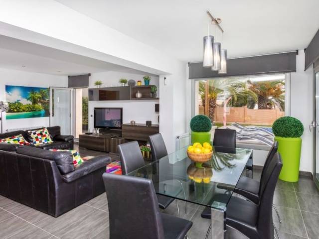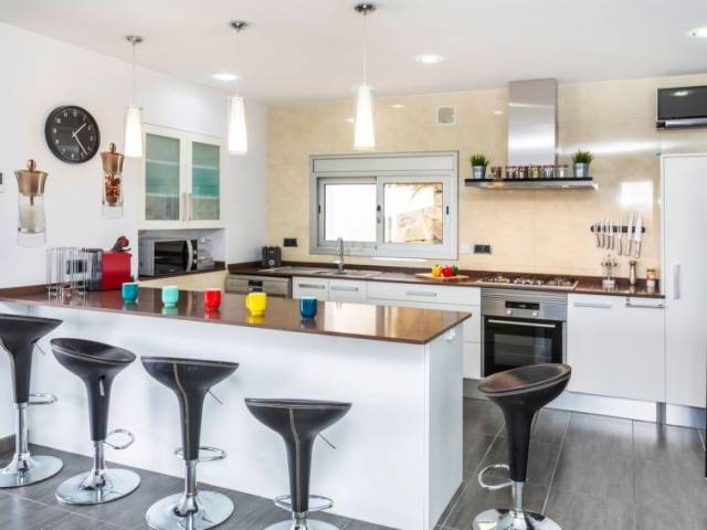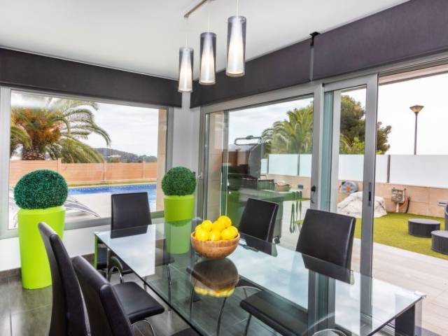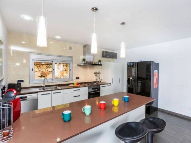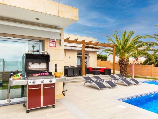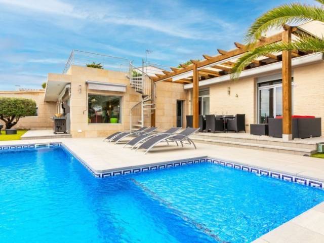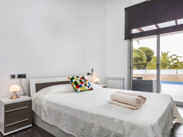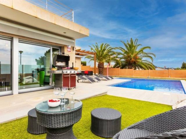 "Chill", villa 5 estancias 250 m2. Espacioso y luminoso, con mobiliario muy confortable y moderno: salón-comedor con mesa de comedor, TV digital, aire acondicionado y bomba de calor, caliente. Salida a la terraza, a la piscina. 1 dorm. doble con 2 camas (90 cm, 190 cm de longitud), TV digital. 2 dorm. dobles, cada habitación con 1 cama de matrimonio (160 cm, 190 cm de longitud), ducha/WC. 1 dorm. doble, grande con 1 cama de matrimonio (160 cm, 190 cm de longitud), baño/bidet/WC y TV digital. Salida a la terraza, a la piscina. Grande cocina abierta (horno, lavavajillas, 4 placas de vitrocerámica, tostadora, hervidor de agua eléctrico, microondas, congelador, cafetera eléctrica) con barra americana. Ducha/WC. Muebles de terraza, tumbonas. Vista lejana al mar y a la localidad. El alojamiento dispone de: lavadora, secadora, plancha, trona, cuna hasta 2 años, secador de pelo. Internet (Wifi, gratis). A tener en cuenta: adecuado para familias. TV solamente ES. HUTG-024555