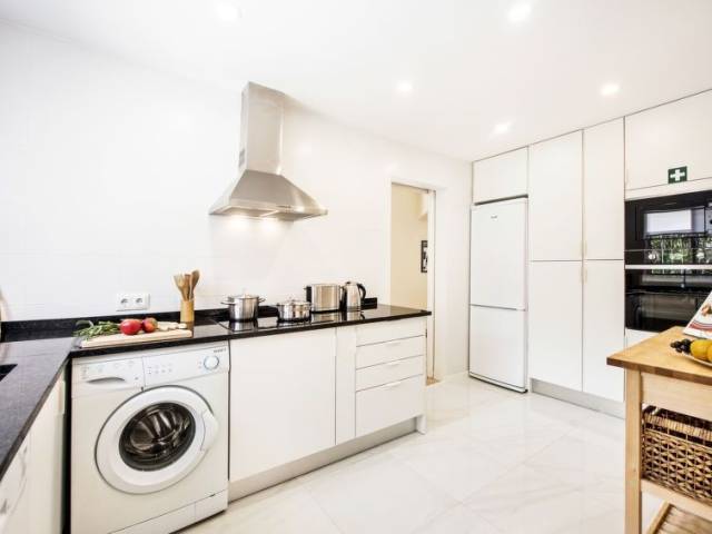 Cocina con 4 quemadores, microondas, horno, lavavajillas, frigorifico y congelador.