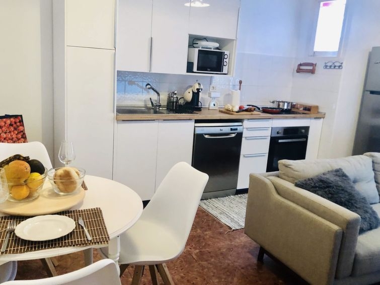 Cocina-comedor con 4 quemadores, microondas, horno, rincón comedor, lavavajillas, frigorifico y congelador.