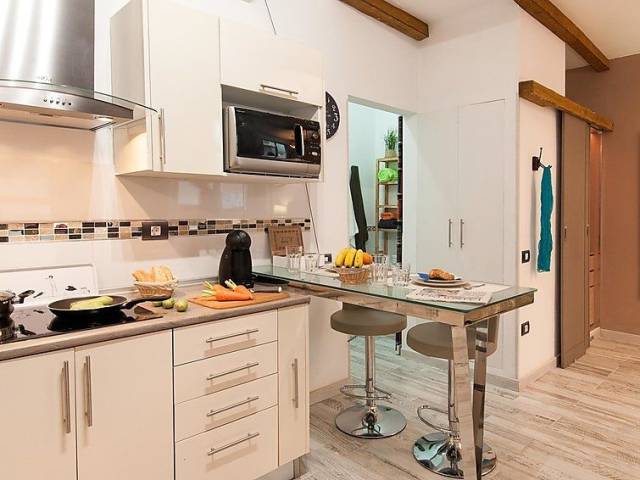 Cocina abierta con 2 quemadores, microondas y rincón comedor.