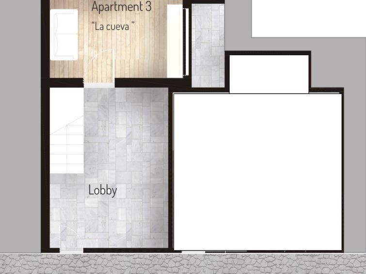 Apartamento de "Cueva", 2 piezas para 2 personas, 35 m2, en la planta baja, con mobiliario confortable y moderno.