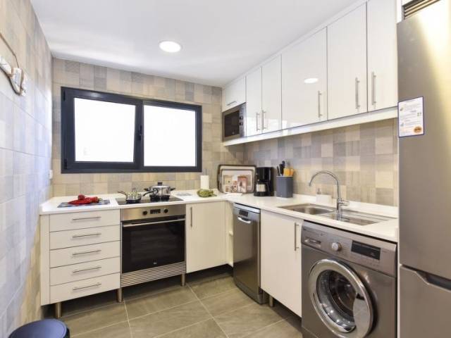 Cocina con 2 quemadores, microondas, horno, lavavajillas, frigorifico y congelador.