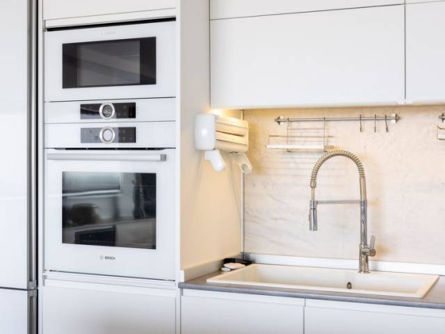 Cocina abierta con 4 quemadores, microondas, horno, lavavajillas, frigorifico y congelador.