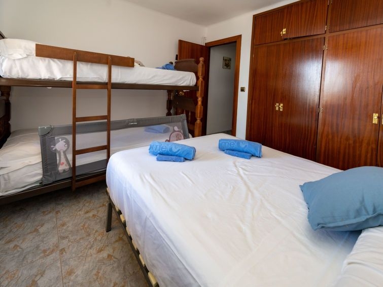 "White", apartamento de 3 estancias 77 m2 en el 4° piso. Luminoso, con mobiliario funcional y confortable: salón-comedor con mesa de comedor, TV y calefacción de gas. Salida al balcón. 1 dorm. con 1 x 2 literas (80 cm, 190 cm de longitud), 1 cama de matrimonio (135 cm, 190 cm de longitud), calefacción de gas. 1 dorm. con 1 cama de matrimonio (135 cm, 190 cm de longitud), calefacción de gas. Cocina (4 fogones, horno, microondas). Ducha/bidet/WC. Balcón. Muebles de balcón. Vista al mar, a la piscina y al jardín. El alojamiento dispone de: lavadora, plancha, trona, cuna hasta 2 años, secador de pelo. Internet (Wifi, gratis). Adecuado para familias. HUTB055106