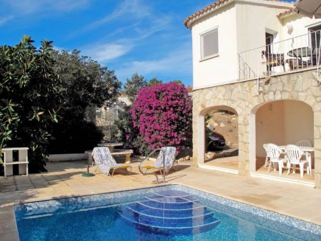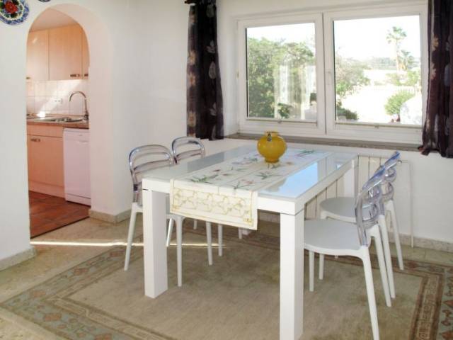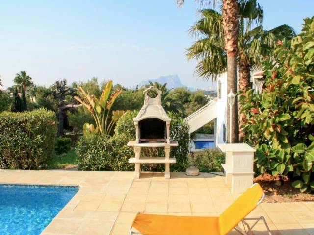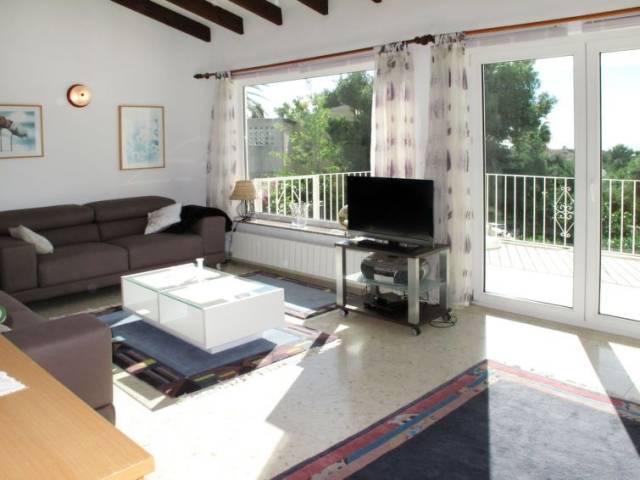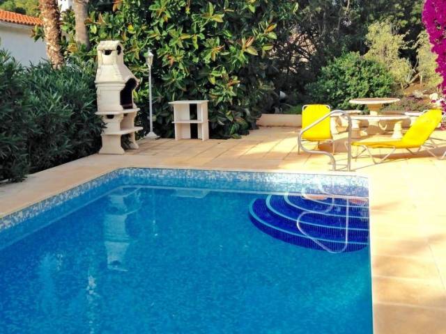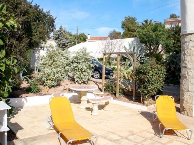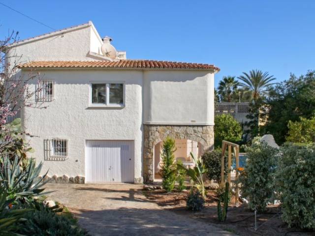 Casa "San Jaime Golf". En el barrio de San Jaime, a 3 km del centro de Moraira, a 130 km del centro de Valencia, area residencial (villas), a 1.2 km del mar. Privado: terreno 1'000 m2, jardín bonito con plantas y árboles, piscina (8 x 4 m, Disponible por temporada: 01.Ene. - 31.Dic.). Ducha exterior, aparcamiento en el mismo terreno. Supermercado 400 m, restaurante 800 m, playa de arena 1.2 km. Campo de golf, tenis 800 m.