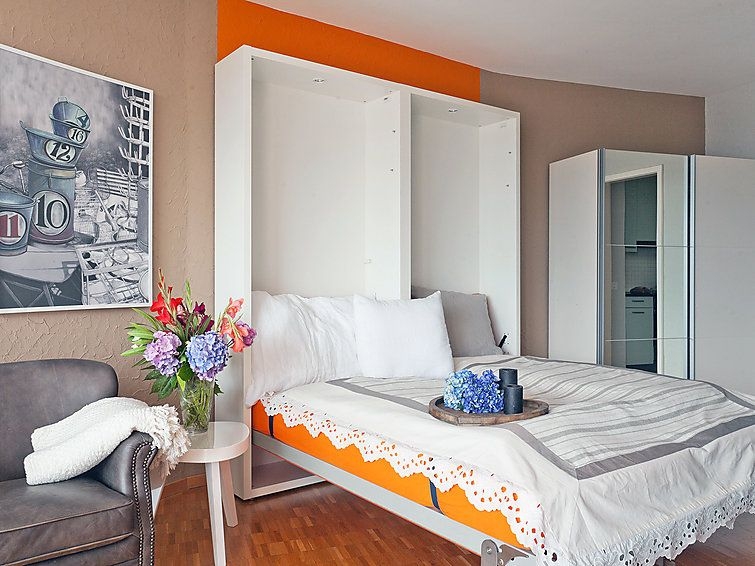 "Double Room Modern" estudio 35 m2 en el 3° piso, orientación sur. Reformado: salón-comedor con 2 camas-armario, TV satélite y radio. Rincón-cocina (horno, cafetera eléctrica, Cápsulas de café (Nespresso) extra). Baño/WC. Calefacción gasóleo. Balcón, orientación sur. Vista espléndida al lago, a las montañas y a la localidad. El alojamiento dispone de: Internet (Wifi, gratis). A tener en cuenta: apartamento para no fumadores, casa para no fumadores. Permitido máximo 1 mascota / perro. NL-00004960