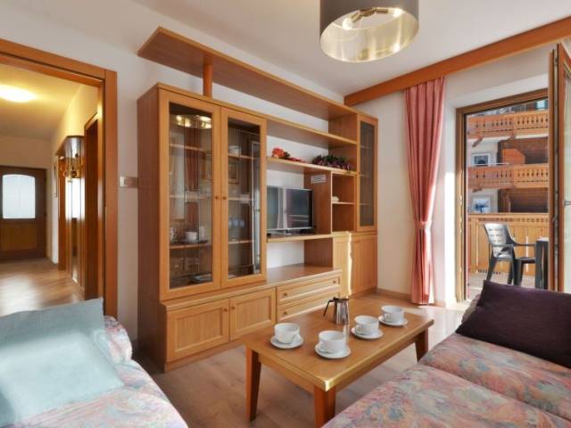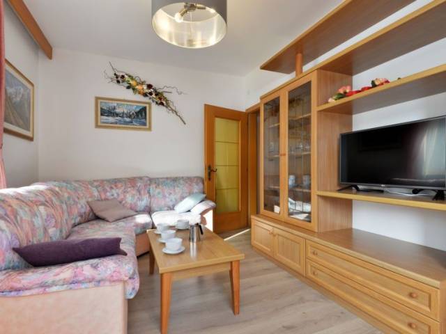 Apartamento de 4 estancias 90 m2 en el 2° piso. Luminoso, con mobiliario bonito y agradable: salón con TV satélite. Salida al balcón. 2 dorm. dobles. Salida al balcón. 1 dorm., pequeño con 2 camas (80 cm). Grande cocina (horno, lavavajillas, 4 placas de vitrocerámica, hervidor de agua eléctrico, microondas, congelador, cafetera eléctrica) con rincón-comedor. Salida al balcón. Baño/WC, ducha/WC. Calefacción por suelo. 2 balcones. Muebles de balcón, tumbonas (2). Vista panorámica a las montañas y al jardín. El alojamiento dispone de: lavadora, trona, cuna. Internet (Wifi). A tener en cuenta: apartamento para no fumadores. CIPAT: 022250-AT-064977