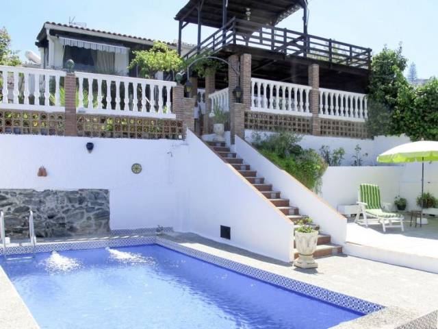 Casa de dos viviendas "Fortuna". En el barrio de Playa Cabria, a 5 km del centro de Almuñécar, a 500 m del mar. Privado: terreno 1'000 m2 (vallada), jardín en diferentes niveles con plantas y árboles, piscina (6 x 3 m, 150 - 200 cm de profundidad, Disponible por temporada: 01.May. - 31.Oct.). Acceso por escaleras (39 escalones) hasta la casa. Aparcamiento en el mismo terreno. Tienda 1.3 km, playa de arena "Playa Cabria" 500 m. A tener en cuenta: el propietario vive en el mismo inmueble.