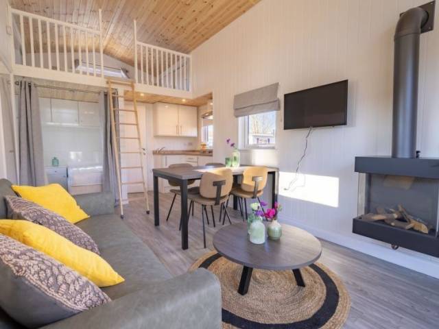 "Tiny House 4", 2 estancias mobile home 30 m2 en 2 plantas. Con mobiliario funcional y agradable: salón-dormitorio con mesa de comedor, TV y estufa de lena. Salida a la terraza. 1 dorm., abierto con cortina con 2 camas. Rincón-cocina (4 fuegos, hervidor de agua eléctrico, cafetera eléctrica). Ducha/WC. Planta superior: (escala) altillo abuhardillado, abierto con 2 camas. Terraza, jardín pequeño. Muebles de terraza. El alojamiento dispone de: trona, cuna (extra). Internet (Wifi, gratis). Plaza de aparcamiento (1 coche). A tener en cuenta: apartamento para no fumadores. Solo se aceptan reservas para vacaciones. Se puede cargar un depóstio de 100 EUR por persona en destino.