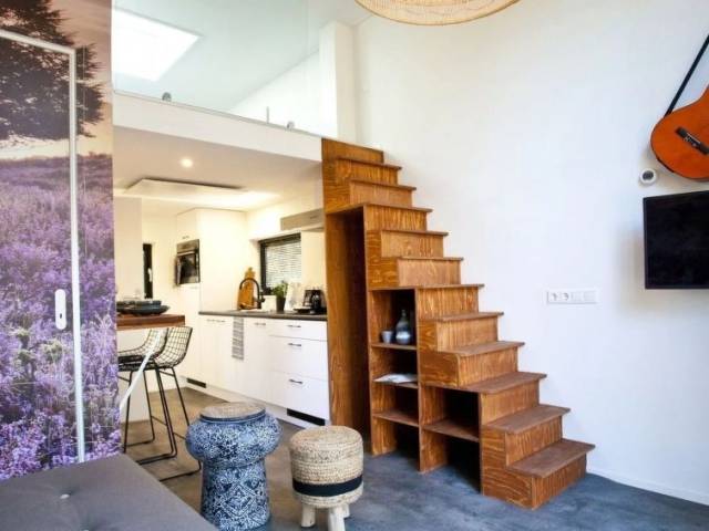 "Tiny House 2", bungalow 2 habitaciones en 2 plantas. Con mobiliario agradable: salón-comedor con rincón-comedor y TV. Rincón-cocina (hervidor de agua eléctrico, cafetera eléctrica, microondas/grill). Planta superior: (escaleras sin barandilla) altillo abierto con 1 cama doble. Terraza. Muebles de terraza. El alojamiento dispone de: Internet (Wifi). A tener en cuenta: casa para no fumadores. El alojamiento es una casa tipo ejemplo o un apartamento tipo ejemplo. Solo se aceptan reservas para vacaciones. Se puede cargar un depóstio de 100 EUR por persona en destino.