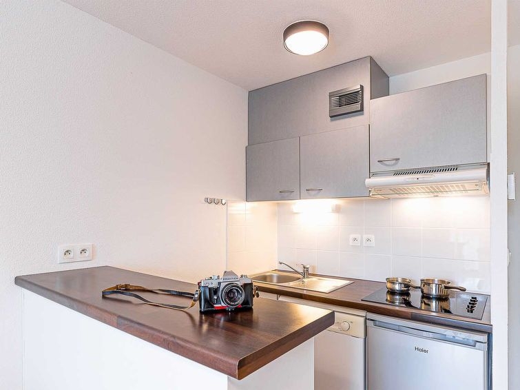 "1 pièce 3 BAQ Les Rives Marines" estudio 26 m2. Salón-dormitorio con 1 sofá-cama doble y 1 cama-nido (1 pers.), alquiler de TV opcional. Rincón-cocina (lavavajillas, 4 placas de vitrocerámica, tostadora, hervidor de agua eléctrico, microondas, cafetera eléctrica). Ducha, WC separado. Calefacción eléctrica. Terraza. Muebles de terraza.
