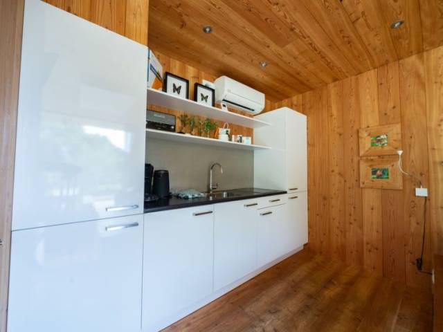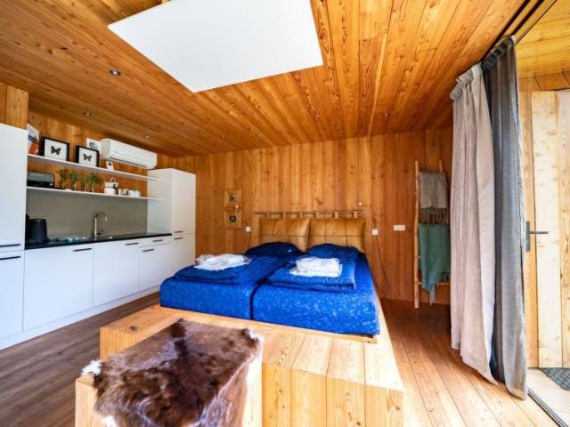 "Fred 2", chalet de madera estudio. Con mobiliario funcional: salón-dormitorio con 1 cama doble, pantalla plana y aire acondicionado. Salida a la terraza. Cocina abierta (2 fogones, microondas, cafetera eléctrica, Cápsulas de café (Nespresso) extra). Ducha/WC. Terraza. Muebles de terraza. El alojamiento dispone de: Internet (Wifi, gratis). A tener en cuenta: casa para no fumadores. Detector de humo.