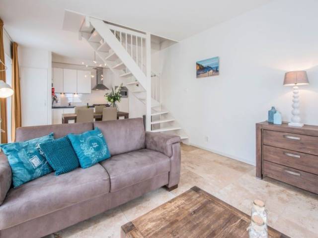 "Flat Fish", bungalow 2 estancias 79 m2. Luminoso, con mobiliario confortable y de buen gusto: salón abierto con mesa de comedor, TV, CD y DVD. Salida a la terraza. Cocina abierta (4 fogones, lavavajillas, cafetera eléctrica, microondas/grill). Calefacción. Planta superior: entrada con WC separado. 1 dorm. con 3 camas (80 cm, 200 cm de longitud). Baño/ducha, doble lavabo. Muebles de terraza. El alojamiento dispone de: lavadora, secadora. Base de iPod. A tener en cuenta: casa para no fumadores. Detector de humo.