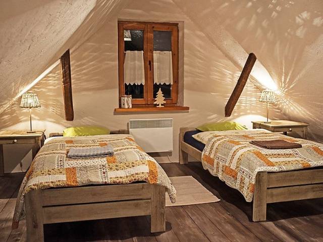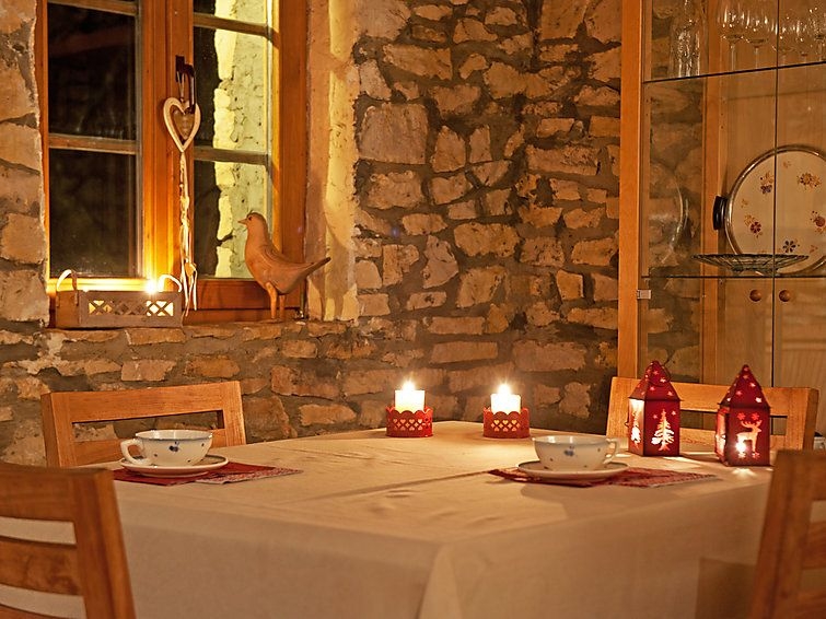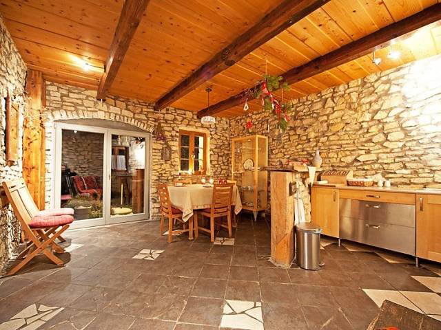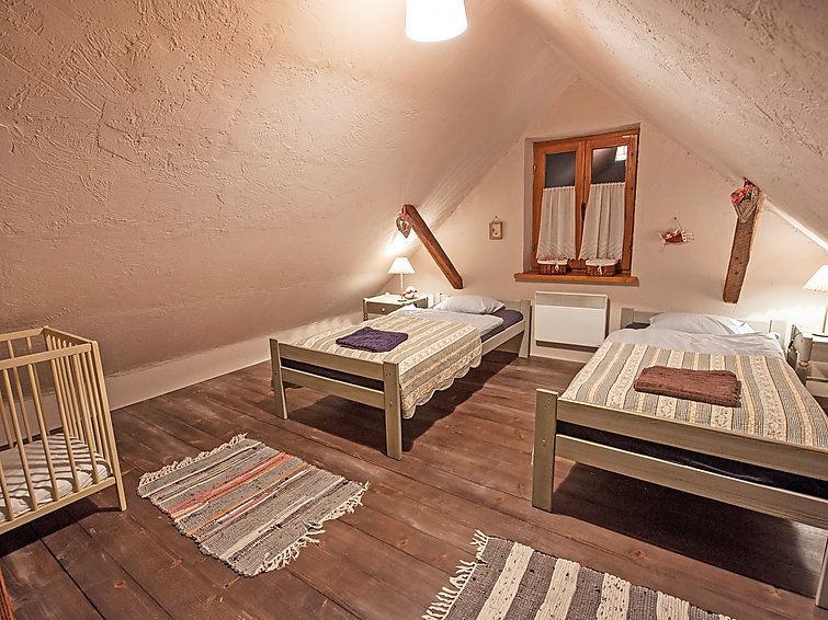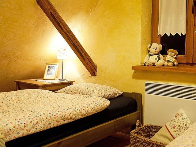 Casa 3 habitaciones 100 m2 en 2 plantas. Con mobiliario rústico y agradable: entrada con 1 sofá-cama doble. Salón-dormitorio con 1 sofá-cama doble, chimenea, radio y CD. Cocina (2 fogones, lavavajillas, congelador, cafetera eléctrica). Salida al jardín, a la terraza. Ducha/WC. Buhardilla: 2 dorm., abuhardillados, cada habitación con 2 camas. Calefacción eléctrica (extra). Tumbonas (4). Vista panorámica muy bonita al valle y al paisaje. El alojamiento dispone de: trona, cuna hasta 3 años, secador de pelo. Internet (Wifi, gratis). A tener en cuenta: apartamento para no fumadores. 1 mascota / perro.