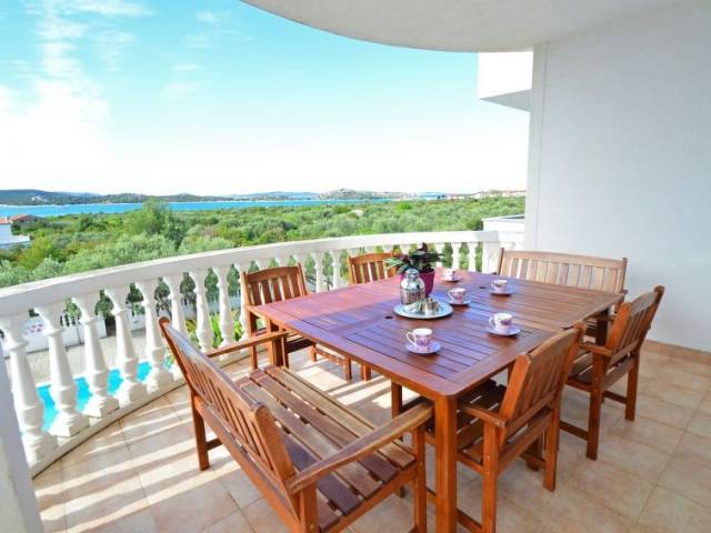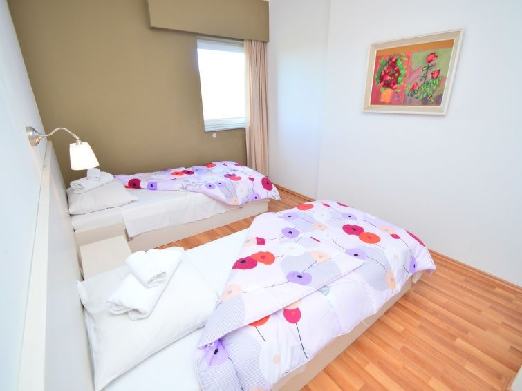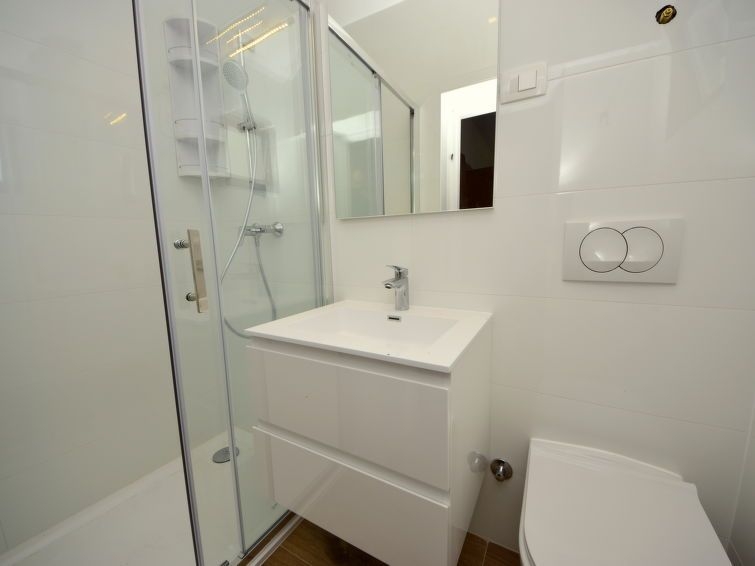 Apartamento de 6 estancias 120 m2 en el 1° piso. Salón-comedor 24 m2 con TV satélite (pantalla plana), aire acondicionado. Salida a la terraza. 1 dorm. con 1 cama de matrimonio (160 cm, 200 cm de longitud), ducha/WC y aire acondicionado. Salida al balcón. 1 dorm. con 2 camas (90 cm, 200 cm de longitud), ducha/WC. Salida al balcón. 1 dorm. con 1 cama doble (2 x 80 cm, 200 cm de longitud), ducha/WC y aire acondicionado. Salida al balcón. 1 dorm. con 1 cama de matrimonio (160 cm, 200 cm de longitud). Salida al balcón. 1 dorm. con 2 camas (90 cm, 200 cm de longitud). Cocina abierta (4 fogones, horno, congelador). Salida al balcón. Ducha/WC. Aire acondicionado, aire caliente (extra). Ningún tipo de calefacción. Balcón 7 m2, 3 balcones 2 m2, terraza 14 m2 parcialmente cubierta. Muebles de terraza. Vista al mar y a la piscina. El alojamiento dispone de: Internet (Wifi, gratis).