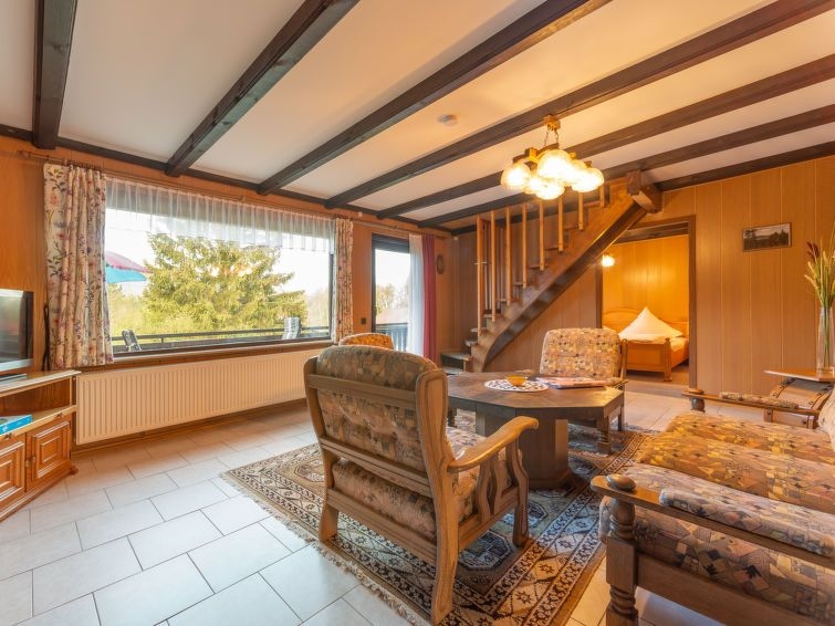Familiar y amable pueblo vacacional "Am Hohen Bogen", idónea para niños. En el barrio de Kummersdorf, en las afueras de la localidad, a 3 km del centro de Arrach, en una pendiente, zona con poco tráfico, a 300 m de un bosque, a 100 m de un lago, a 9 km de las pistas de esquì. Comunitario: voleibol, parque infantil (tobogán, columpio, cajón de arena). En el complejo: recepción, tenis de mesa (extra). Sala para guardar bicicleta, calefacción central. Aparcamiento junto a la casa. Tienda 3 km, tienda de comestibles 3 km, supermercado 3 km, restaurante 3 km, panadería 3 km, estación de tren "Hohenwarth" 1.5 km, playa de césped "Seepark Arrach" 5 km, piscina 10 km, piscina termal 10 km, lago "Seepark Arrach" 5 km. Campo de golf (9 hoyos) 6 km, tenis 6 km, centro ecuestre 800 m, telesilla 9 km, remontes 9 km, pistas de esquí 9 km, alquiler de esquís 11 km, escuela de esquí 9 km, pista de esquí de fondo 11 km. Atracciones en los alrededores: Bayerwald-Tierpark Lohberg 15 km, Spielbank Bad Kötzting, Fun-Park Neukirchen, Tiergarten Straubing, Pullman-City. Zonas de esquí populares fácilmente accesibles: Eck 6 km, Am Hohen Bogen 9 km, Arber 29 km. Zona de senderismo Arberregion. A tener en cuenta: coche recomendable. Natación 100 metros. Paseo en barcas, pesca 500 m. El parque se compone de casas de 2 plantas, todas con áreas compartidas de juegos y césped. Apartamento de 3 estancias 75 m2, en planta superior. Con mobiliario agradable y con mucha madera: salón 35 m2 con TV satélite (pantalla plana). Salida al balcón. 1 dorm. 13 m2 con 1 cama doble (200 cm, 200 cm de longitud). 1 dorm. 9 m2 con 1 cama (90 cm, 190 cm de longitud), 1 x 2 literas (90 cm, 190 cm de longitud). Cocina abierta 9 m2 (4 fogones, horno, tostadora, hervidor de agua eléctrico, microondas, cafetera eléctrica) con rincón-comedor. Ducha/WC. Calefacción de gas. Balcón grande 20 m2, orientación sur y orientación oeste. Muebles de balcón. Vista bonita a las montañas. El alojamiento dispone de: Internet (Wifi, gratis). A tener en cuenta: apartamento para no fumadores. Permitido máximo 1 mascota / perro. Entrada privada, detector de humo.
