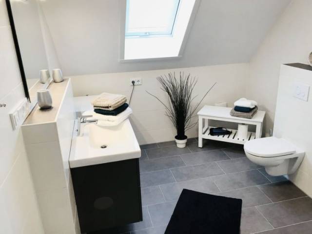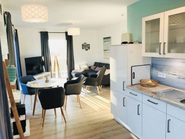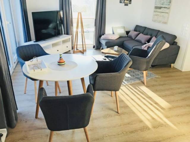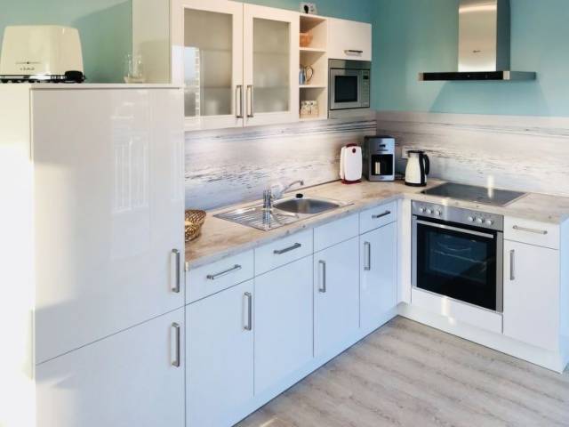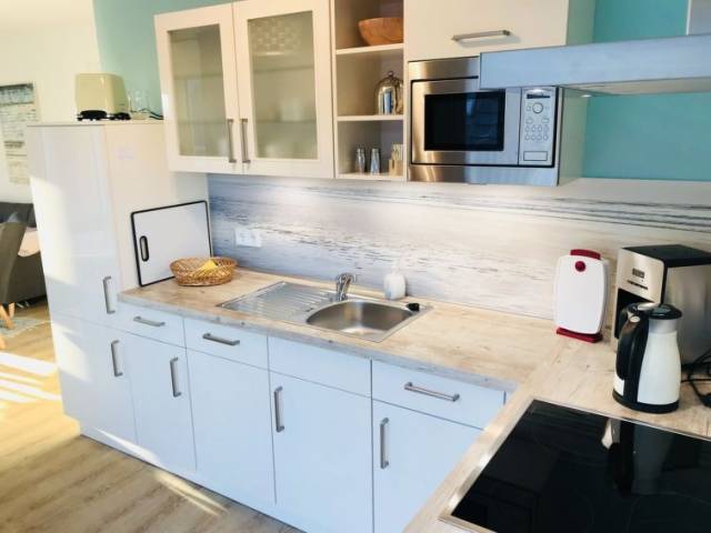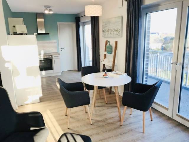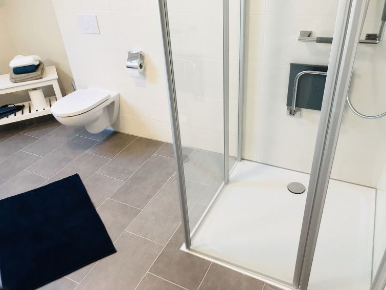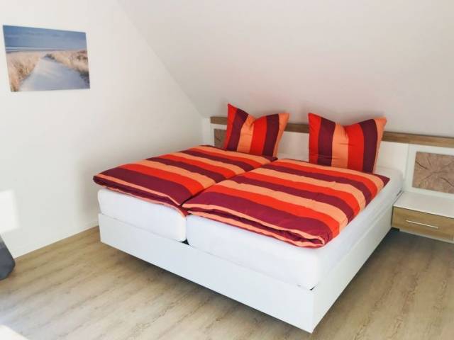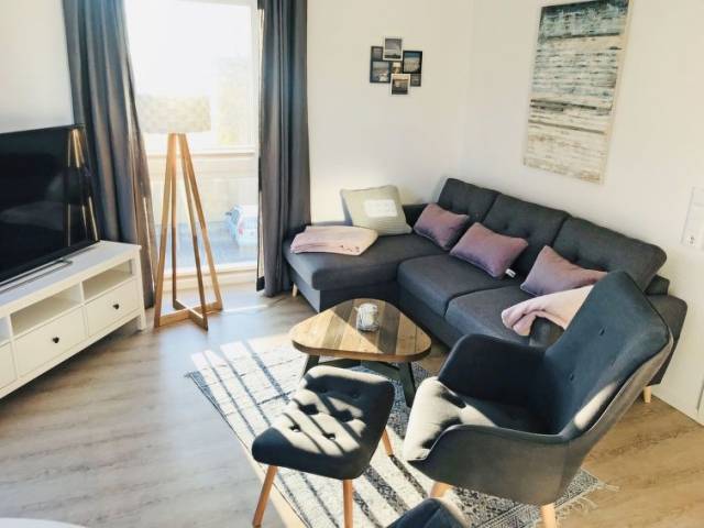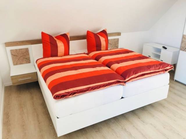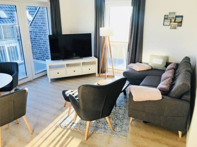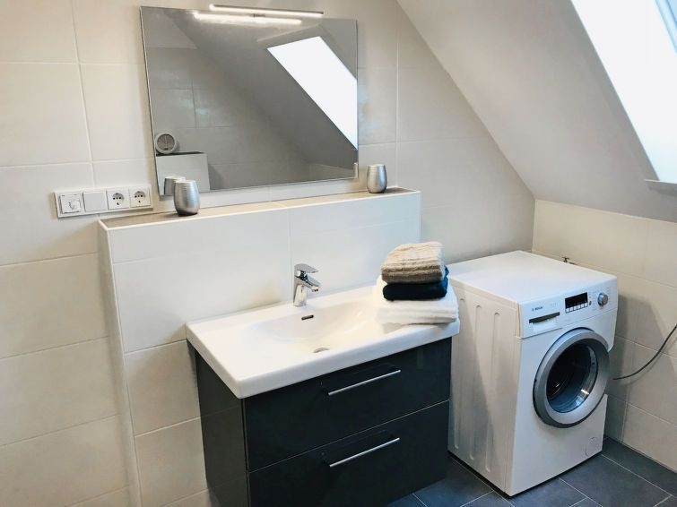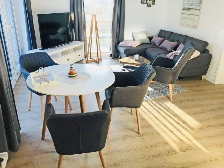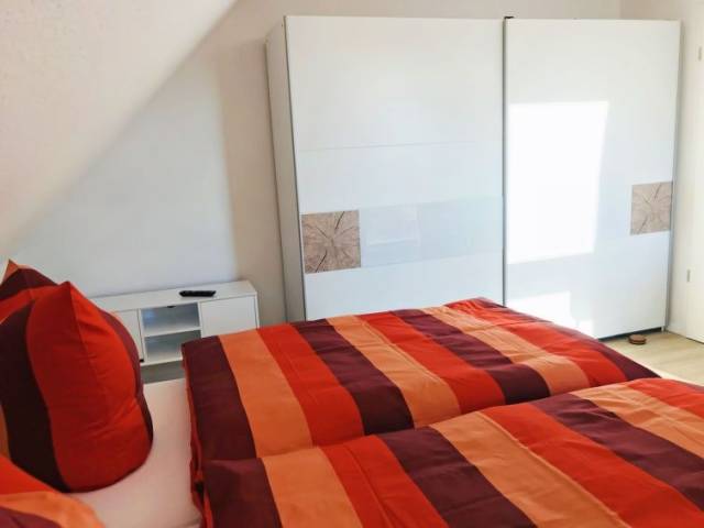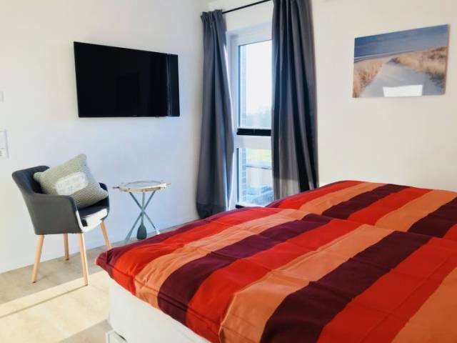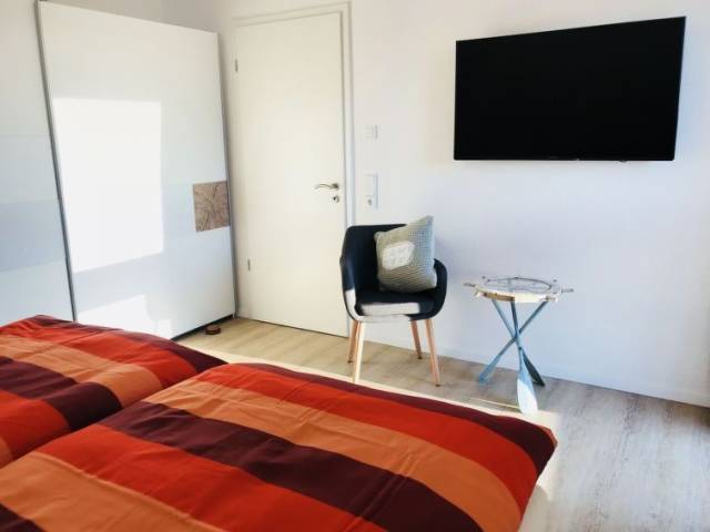 "Ankerplatz", apartamento de 2 estancias 55 m2 en el 2° piso. Parcialmente abuhardillado, con mobiliario moderno y de buen gusto: salón-comedor 22 m2 con 1 sofá-cama doble (180 cm, 200 cm de longitud), TV cable (pantalla plana), radio y equipo de música. Salida al balcón. 1 dorm. 12 m2 con 1 cama doble (2 x 90 cm, 200 cm de longitud), TV cable (pantalla plana). Rincón-cocina (horno, lavavajillas, 4 placas de vitrocerámica, tostadora, hervidor de agua eléctrico, microondas, cafetera eléctrica). Ducha/WC. Balcón 8 m2. Muebles de balcón, tumbonas (2), trastero. El alojamiento dispone de: lavadora, plancha, trona (extra), secador de pelo. Internet (Wifi, gratis). A tener en cuenta: apartamento para no fumadores. Detector de humo.