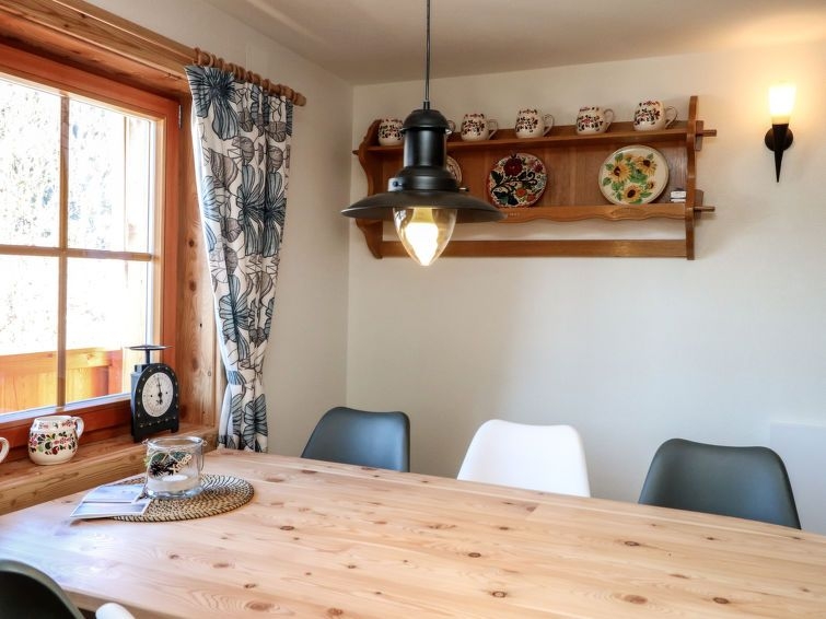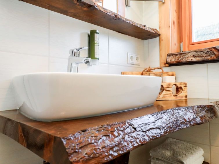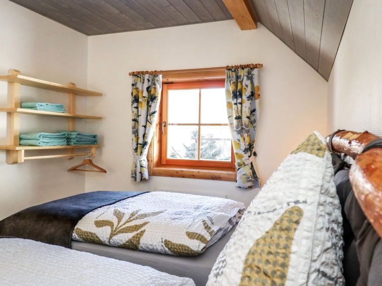 Chalet de madera 5 estancias 110 m2 en 2 plantas. Espacioso, parcialmente abuhardillado, con mobiliario muy de buen gusto y agradable: entrada. Salón con TV satélite (pantalla plana). Salida a la terraza. Grande cocina-comedor (horno, lavavajillas, 4 placas de vitrocerámica, microondas, congelador, cafetera eléctrica) con mesa de comedor. Ducha, WC separado. Planta superior: 2 dorm. dobles. 1 dorm. con 3 camas. Ducha/WC. Calefacción eléctrica, horno de esteatita. Suelo de madera. 2 terrazas. Muebles de terraza, barbacoa. Vista muy bonita a las montañas y a la localidad. El alojamiento dispone de: trona, cuna hasta 3 años, secador de pelo. A tener en cuenta: casa para no fumadores. Detector de humo, extintores.
