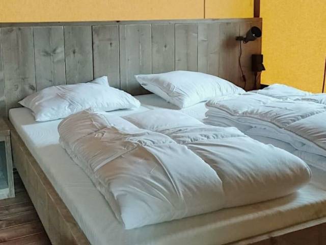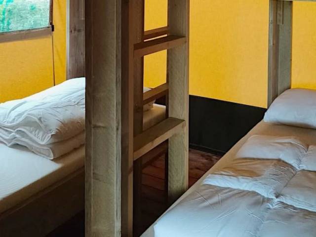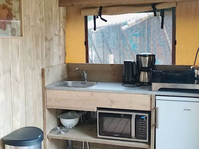 "Safaritent 6", estudio casa de campo 50 m2. Con mobiliario sencillo: salón-dormitorio con 2 x 2 literas, 1 cama doble, mesa de comedor y pantalla plana. Salida a la terraza. Pequeña cocina (4 Placas de inducción, hervidor de agua eléctrico, microondas, cafetera eléctrica). Ducha/WC. Ningún tipo de calefacción. Terraza. Muebles de terraza. El alojamiento dispone de: Internet (Wifi, gratis). A tener en cuenta: apartamento para no fumadores.