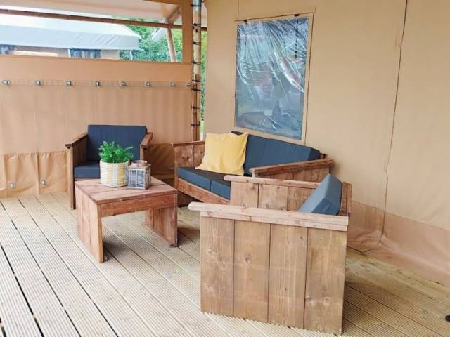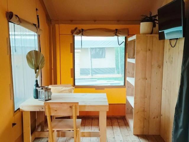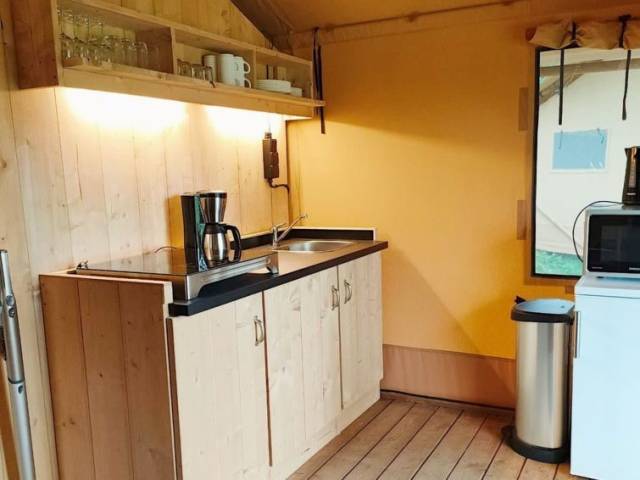 "Glampingtent Kompact 2", estudio casa de campo 50 m2. Con mobiliario funcional: salón-dormitorio con 1 cama doble, mesa de comedor y pantalla plana. Salida a la terraza. Pequeña cocina (4 Placas de inducción, hervidor de agua eléctrico, cafetera eléctrica, microondas/grill). Ducha/WC. Ningún tipo de calefacción. Terraza. Muebles de terraza. El alojamiento dispone de: Internet (Wifi, gratis). A tener en cuenta: apartamento para no fumadores.