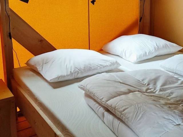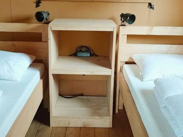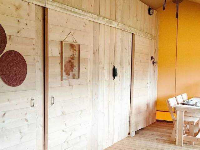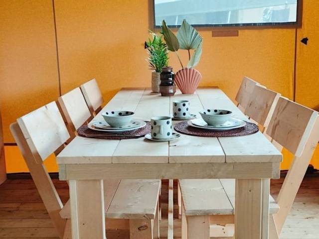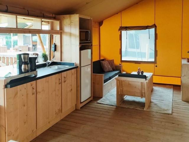 "Glampingtent Dreamer 4", 3 estancias casa de campo 50 m2. Con mobiliario sencillo: salón-comedor con mesa de comedor y TV. Salida a la terraza. 1 dorm. con 2 camas. 1 dorm. con 1 x 2 literas. Pequeña cocina abierta (4 Placas de inducción, hervidor de agua eléctrico, cafetera eléctrica, microondas/grill). Ducha/WC. Ningún tipo de calefacción. Terraza. Muebles de terraza. El alojamiento dispone de: Internet (Wifi, gratis). A tener en cuenta: apartamento para no fumadores.