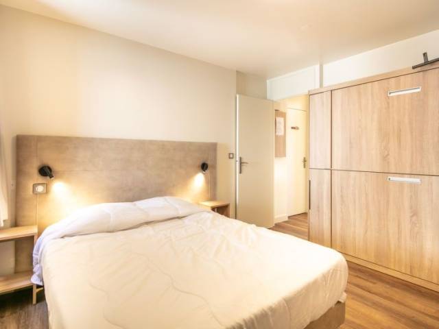 Apartamento de 2 estancias 40 m2. Con mobiliario funcional: salón-dormitorio con 1 sofá-cama doble y TV (pantalla plana). 1 dorm. con 1 x 2 literas, 1 cama de matrimonio. Rincón-cocina (horno, lavavajillas, 2 placas de vitrocerámica, tostadora, hervidor de agua eléctrico, microondas, congelador, cafetera eléctrica, Cápsulas de café (Nespresso) extra). Ducha, WC separado. Calefacción. Terraza. Tumbonas. Vista al valle. El alojamiento dispone de: secador de pelo. Internet (Wifi, gratis). Plaza de aparcamiento. A tener en cuenta: permitido máximo 1 mascota / perro. Detector de humo.