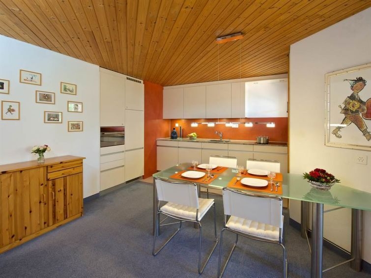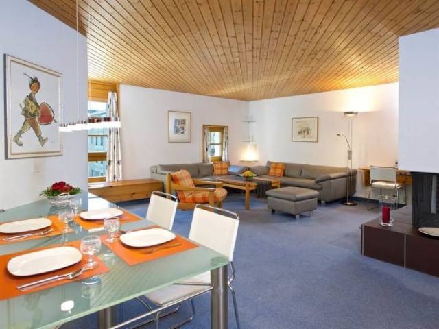 Apartamento de vacaciones de 3½ habitaciones en el Hotel Schweizerhof con dos dormitorios separados, cada uno con una cama doble; salón con chimenea; cocina abierta; balcón orientado al suroeste; garaje subterráneo; sala de esquí y snowboard; uso compartido de la piscina familiar con sauna, bio-sauna y baño de vapor gratuitos. 80 m2.