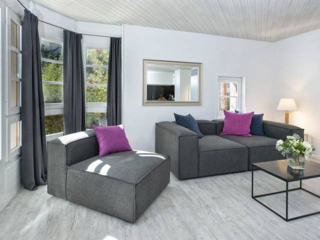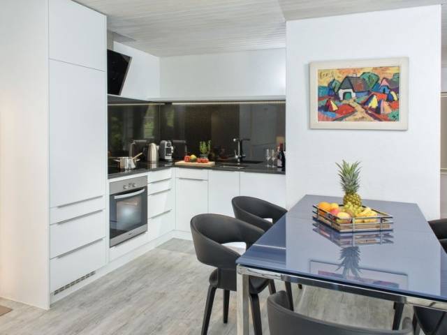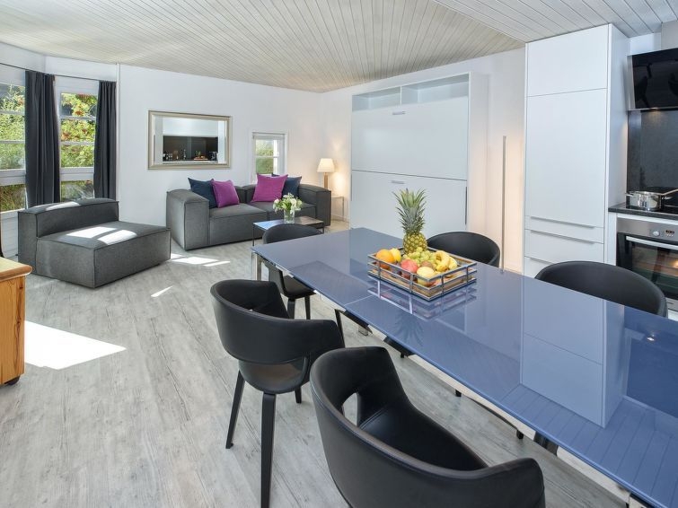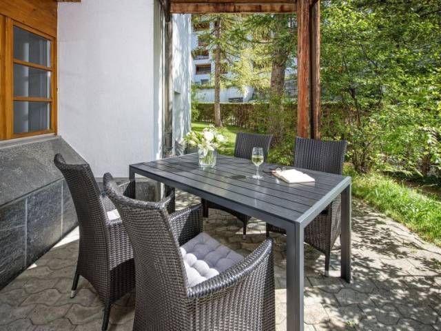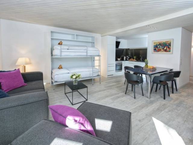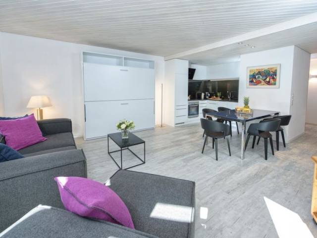 Apartamento de vacaciones de 2½ habitaciones en la planta baja del Hotel Schweizerhof con un dormitorio separado; sala de estar con plazas para que duerman dos personas; cocina abierta; balcón; plaza de aparcamiento en el garaje subterráneo; uso gratuito de la piscina climatizada con sauna, biosauna y baño de vapor. El apartamento está situado en el Sector 5 del Hotel Schweizerhof.