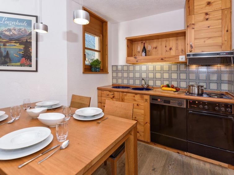 El moderno apartamento de vacaciones amueblado y renovado con aprox. 70 m2, dos cuartos de baño y un dormitorio separado se encuentra en la planta superior de la casa principal, con suelo de madera maciza. Desde el balcón tiene vistas al "Lenzerhorn", el ascensor de pasajeros está a pocos metros de distancia. La sala de estar con cocina abierta y comedor, así como un cuarto de baño con inodoro y bañera se encuentra en el nivel inferior, una cómoda cama doble 160x200 se puede plegar a cabo El gran dormitorio con una cama doble 180x210 se encuentra en el ático convertido, tiene su propio cuarto de baño con bañera y WC y es accesible a través de escaleras. Ofrecemos W-LAN gratis.