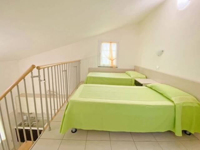 "Ponente", apartamento de 2 estancias 56 m2. Con mobiliario confortable y moderno: salón-comedor con 1 sofá-cama y ducha/bidet/WC. Salida al jardín. 1 dorm. doble. Rincón-cocina (microondas, congelador) con TV satélite y aire acondicionado. Planta superior: altillo con 2 camas. Terraza-jardín. Muebles de terraza. El alojamiento dispone de: caja fuerte, secador de pelo. Internet (Wifi, gratis). Plaza de aparcamiento n. 1.