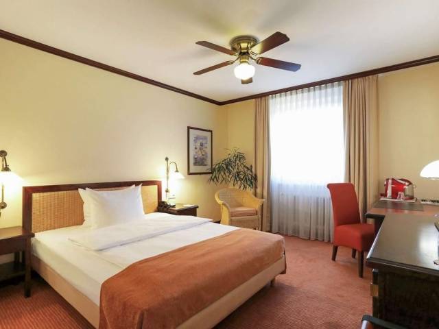 Las elegantes habitaciones del Steigenberger Hotel Frankfurt Langen presentan una decoración con relajantes tonos tierra. Disponen de un ventilador sobre la cama y de un amplio escritorio.