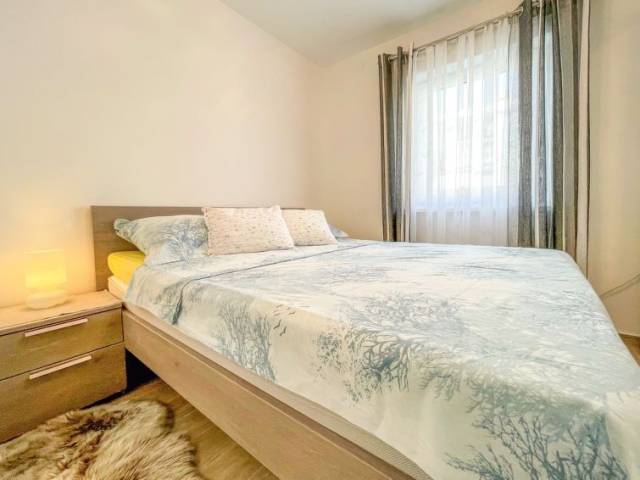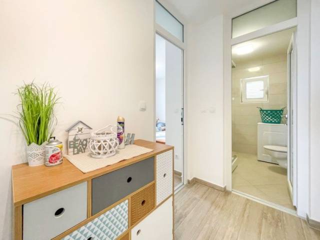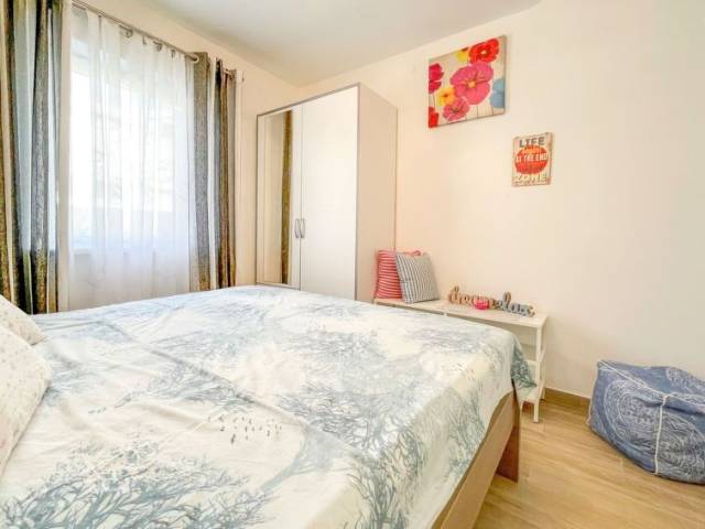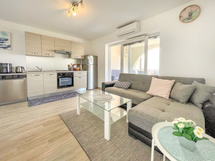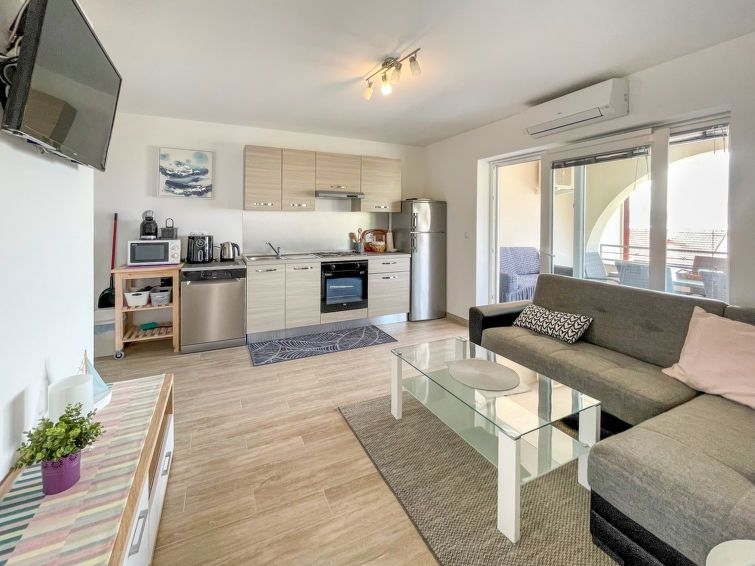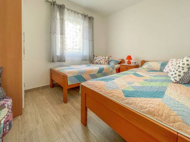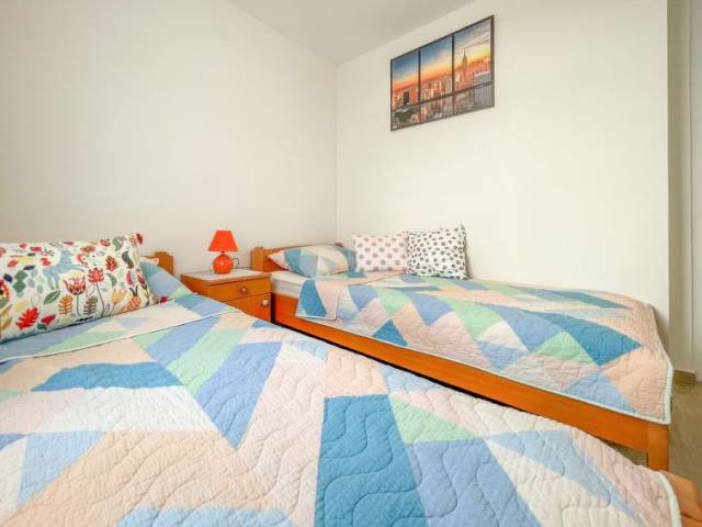 Apartamento de 3 estancias 60 m2 en el 1° piso, orientación sur. Vivienda adecuada para 2 adultos + 2 niños. Con mobiliario confortable: salón-comedor con TV satélite y aire acondicionado. Salida a la terraza. 1 dorm. con 1 cama de matrimonio (160 cm, 200 cm de longitud). 1 dorm. con 2 camas (90 cm, 200 cm de longitud). Cocina abierta (4 fogones, horno, lavavajillas, tostadora, hervidor de agua eléctrico, microondas, congelador, cafetera eléctrica). Ducha/WC. Ningún tipo de calefacción. Terraza 16 m2, cubierta. Muebles de terraza. Vista bonita al mar. El alojamiento dispone de: lavadora. Internet (Wifi, gratis). Plaza de aparcamiento (1 coche). Adecuado para familias.