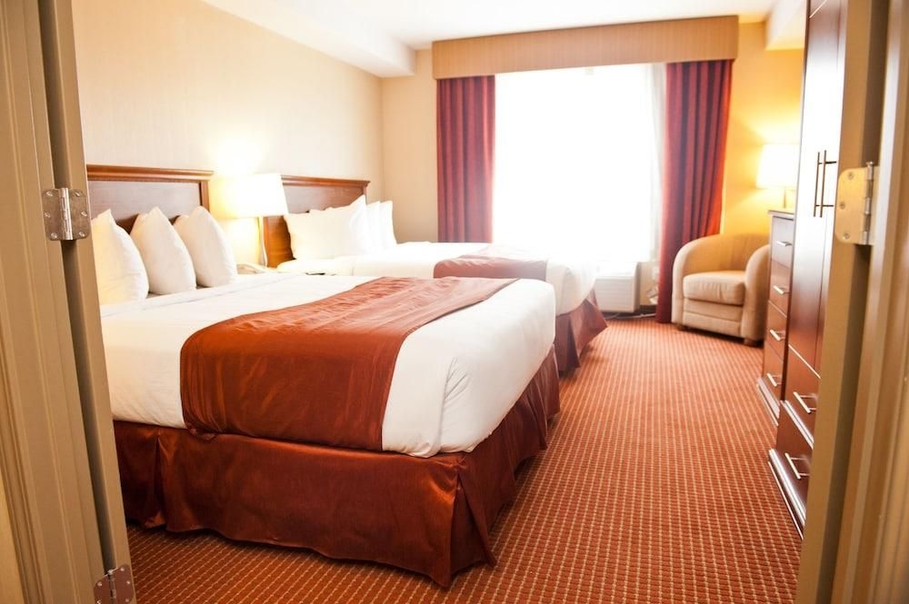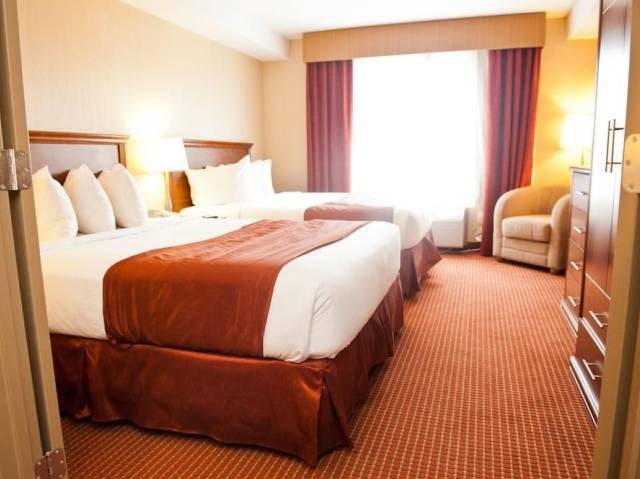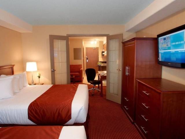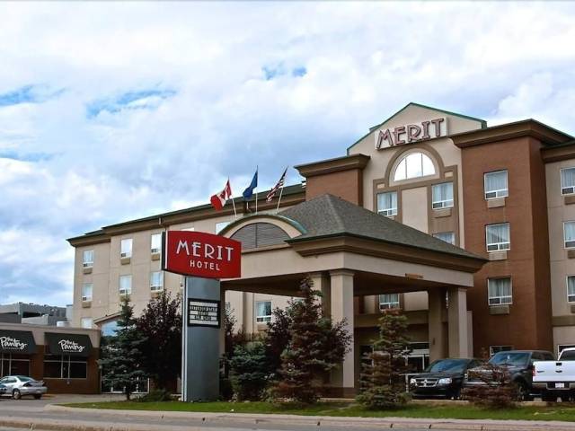 Descripción: Ubicación. Merit Hotel and Suites se encuentra en el centro de Fort McMurray, cerca de Heritage Park, MacDonald Island Park y Oil Sands Discovery Centre. Características del hotel. Merit Hotel and Suites dispone de un restaurante y bar o lounge. Se ofrece servicio de habitaciones. Entre las opciones de ocio y esparcimiento figuran piscina cubierta, bañera de hidromasaje y gimnasio. Este establecimiento de 3 estrellas cuenta con centro de negocios y ofrece sala de reuniones para grupos pequeños y sala de conferencias. Las zonas comunes disponen de acceso a Internet de alta velocidad alámbrico e inalámbrico gratuito. El parking es gratuito. El establecimiento ofrece, además, los siguientes servicios: lavandería, cambio de divisas y check-in rápido. El establecimiento dispone de zonas de fumadores. Habitaciones. Las 92 habitaciones con aire acondicionado de Merit Hotel and Suites cuentan con cafetera y tetera y cajas fuertes. Las camas tienen ropa de cama de alta calidad. Las habitaciones están dotadas de sala de estar separada y escritorio. Las cocinas están equipadas con frigorífico. Los baños disponen de bañera y artículos de higiene personal gratuitos. Se ofrece acceso a Internet de alta velocidad alámbrico e inalámbrico gratuito. Las habitaciones están dotadas de periódicos gratuitos entre semana, periódicos gratuitos y teléfono inalámbrico con correo de voz. Televisor con canales por cable y conexión a Internet por televisión (gratuita). Las habitaciones también están provistas de mando a distancia para las luces, cortinas oscuras, plancha y tabla de planchar y radio despertador. Información de la habitación: Nombre: Business Suite Descripción: One King Bed Disfrute de un sueño reparador con ropa de cama de primera calidad, cortinas opacas y control remoto de luces y cortinas. El acceso a Internet alámbrico e inalámbrico gratuito le mantiene conectado, y se ofrecen canales por cable para su entretenimiento. La cocina privada está equipada con nevera y cafetera/tetera. El baño privado está provisto de bañera y artículos de higiene personal gratuitos. Aire acondicionado, zona de estar independiente y teléfono inalámbrico con llamadas locales gratuitas son algunas de las comodidades que ofrece. Nombre: Habitación Superior Descripción: Una cama doble Disfrute de un sueño reparador con ropa de cama de primera calidad, cortinas opacas y control remoto de luces y cortinas. El acceso a Internet alámbrico e inalámbrico gratuito le mantiene conectado, y se ofrecen canales por cable para su entretenimiento. La cocina privada está equipada con nevera y cafetera/tetera. El baño privado está provisto de bañera y artículos de higiene personal gratuitos. Aire acondicionado, zona de estar independiente y teléfono inalámbrico con llamadas locales gratuitas son algunas de las comodidades que ofrece. Política del hotel: Deberá presentar un documento de identidad con fotografía al hacer el registro de entrada. El importe se cargará en la tarjeta de crédito en el momento de efectuar la reserva. No se garantiza el tipo de cama ni las preferencias de fumador.Su reserva es de prepago y está garantizada para llegadas tardías. El cargo total incluye todos los gastos e impuestos de la habitación, así como las tasas de acceso y reserva. Cualquier cargo incidental, como aparcamiento, llamadas telefónicas y servicio de habitaciones, se gestionará directamente entre usted y el establecimiento. Instrucciones para el registro de entrada: Pueden aplicarse cargos por persona extra que varían en función de la política del hotel. Se requiere un documento de identidad con fotografía emitido por el gobierno y una tarjeta de crédito o un depósito en efectivo en el momento del registro de entrada para cubrir los gastos adicionales. Las peticiones especiales están sujetas a disponibilidad en el momento del registro de entrada y pueden conllevar cargos adicionales. Las peticiones especiales no se pueden garantizar. Información sobre el establecimiento: No se admiten mascotas La hora de entrada comienza a las 15:00 La hora de salida es a las 11:00