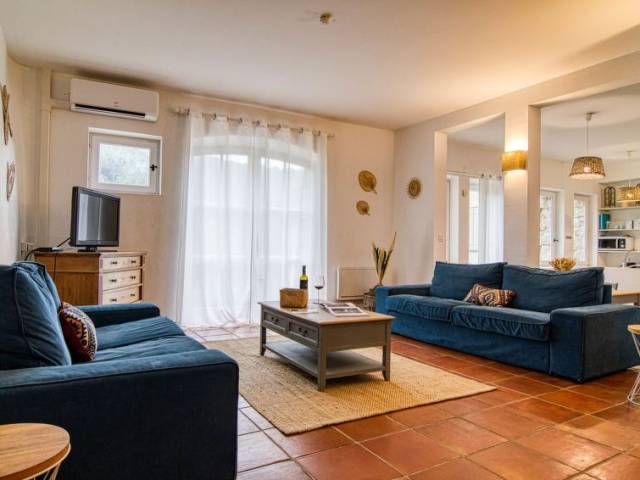 "Les Grenaches", casa adosada 4 estancias 130 m2 en 2 plantas. Con mobiliario confortable y bonito: salón con chimenea (sólo con función decorativa), TV y aire acondicionado. 1 dorm. con 3 camas (90 cm, 190 cm de longitud), ducha/WC. Salida a la terraza. Cocina abierta (horno, lavavajillas, 4 placas de vitrocerámica, tostadora, microondas, cafetera eléctrica). Planta superior: 1 dorm. con 3 camas (90 cm, 190 cm de longitud), baño/WC. 1 dorm. con 1 cama de matrimonio (160 cm, 190 cm de longitud), ducha/WC. Calefacción eléctrica. Terraza 30 m2. Muebles de terraza, barbacoa. El alojamiento dispone de: lavadora, plancha, cuna hasta 3 años. Internet (Wifi, gratis). Plaza de aparcamiento junto a la casa. A tener en cuenta: un dormitorio doble está fuera del apartamento. Casa para no fumadores. Detector de humo. Oferta de un propietario comercial según el art. 155, IV, CGI