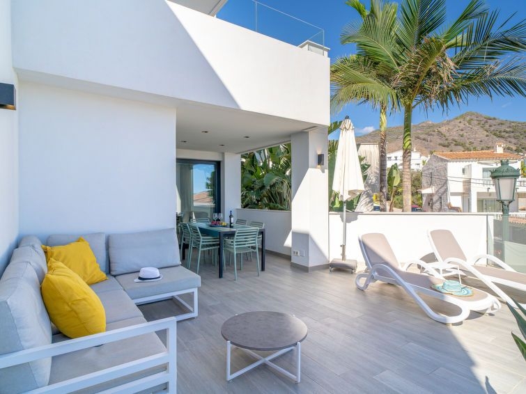 Nerja: Casa "Royal", moderna, bonita, confortable, adosada por un lado. En la localidad, a 1.5 km del centro de Nerja, area residencial (villas), a 500 m de la playa, orientación sur. Comunitario: patio, piscina (5 x 10 m, 97 - 162 cm de profundidad, Disponible por temporada: 01.Ene. - 31.Dic.). Ducha exterior, aparcamiento. Tienda, supermercado 300 m, centro comercial 20 km, restaurante, panadería, café 300 m, zona peatonal 1.5 km, alquiler de bicicletas 500 m, bar al aire libre 300 m, parada de autobús 150 m, estación de tren "Málaga" 52 km, ferry "Málaga" 52 km, playa de arena "Burriana", centro de buceo 500 m, piscina termal 200 m. Puerto deportivo 17 km, puerto para yates 17 km, escuela de surf 17 km, escuela de vela 17 km, tenis, polideportivo 200 m. Atracciones en los alrededores: Frigilian, Torre del Mar, La Herradura, Granada, Málaga, Ronda. Zonas de esquí populares fácilmente accesibles: Sierra Nevada. Zona de senderismo Sierra Almijara, Sierra Tejeda. El propietario no acepta grupos. A tener en cuenta: carga y descarga de equipaje posible en la casa de vacaciones. La propiedad con ref: ES5405.691.1 está situada en la misma parcela.