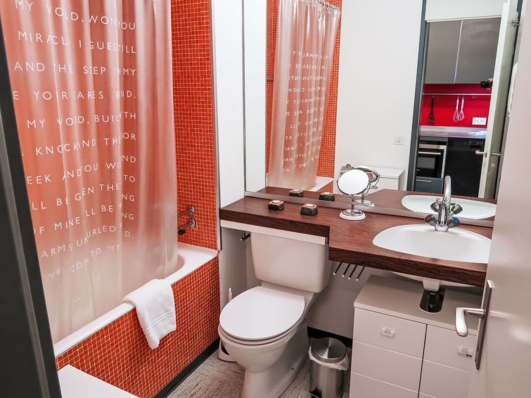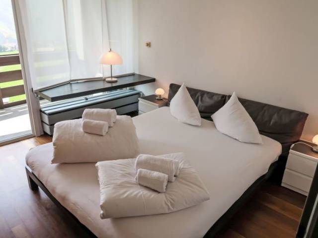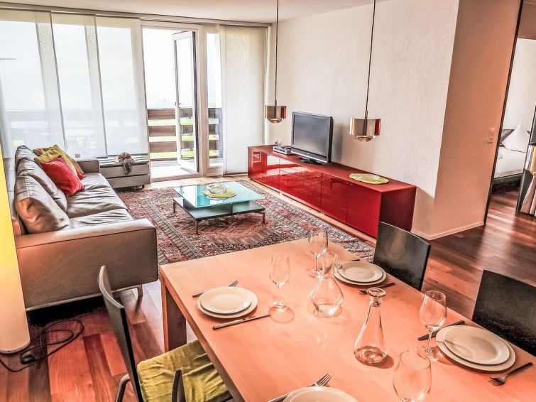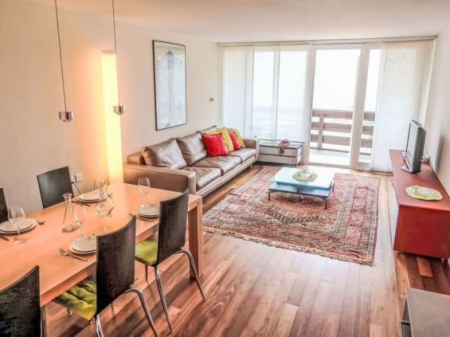 "Apt B 096", apartamento de 2 estancias 56 m2 en el 9° piso. Con mobiliario confortable y agradable: salón-comedor con TV satélite (pantalla plana). Salida al balcón. 1 dorm. con 1 cama doble (160 cm, 200 cm de longitud). Salida al balcón. Rincón-dormitorio con 2 camas. Cocina abierta (horno, lavavajillas, 4 Placas de inducción, tostadora, cafetera eléctrica, Cápsulas de café (Nespresso) extra, microondas/grill). Baño/WC. Balcón grande, orientación sur. Muebles de balcón. Vista bonita a las montañas y al paisaje. El alojamiento dispone de: secador de pelo. Internet (Wifi, gratis). A tener en cuenta: apartamento para no fumadores. En lugar de un dormitorio cerrado, algunos espacios para dormir están situados en una zona diáfana (galería, alcoba, etc.).