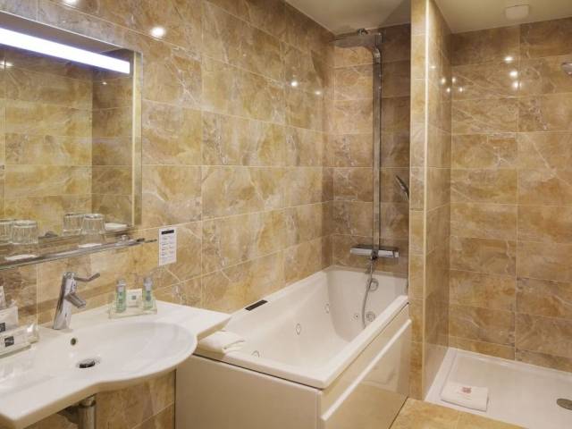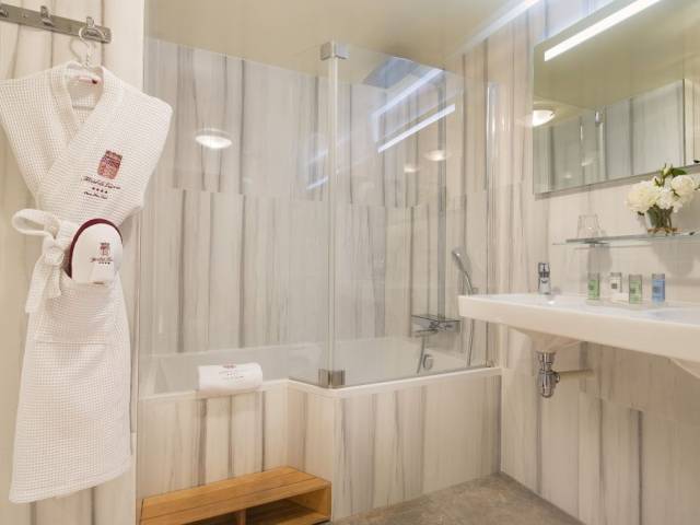 Esto es lo que encontrarás en la habitación para descansar después de un día largo: un reloj alarma, una ducha, una TV, un minibar, batas y pantuflas. El equipamiento de la habitación depende de su categoría.