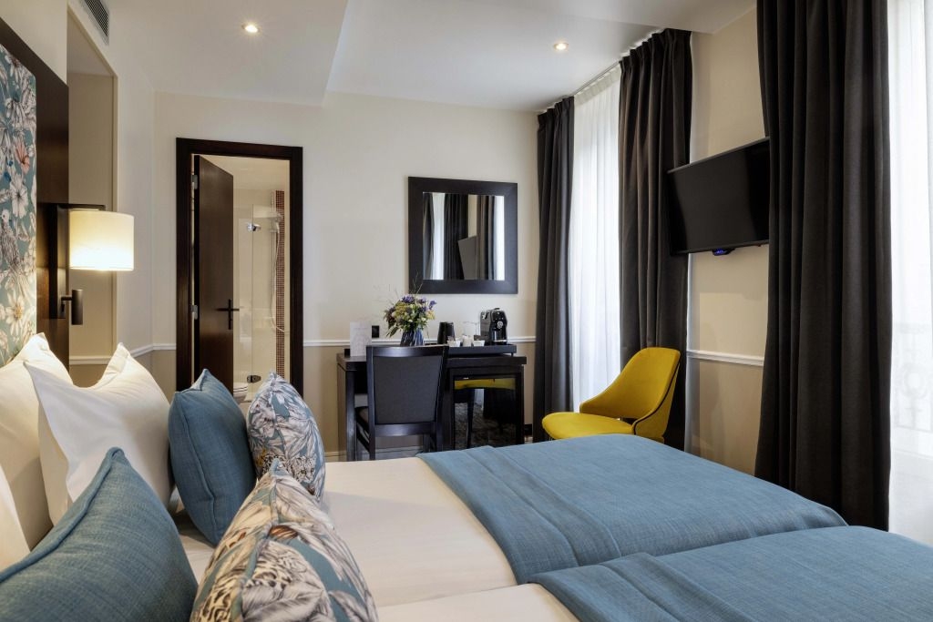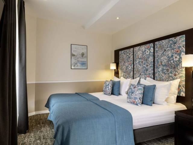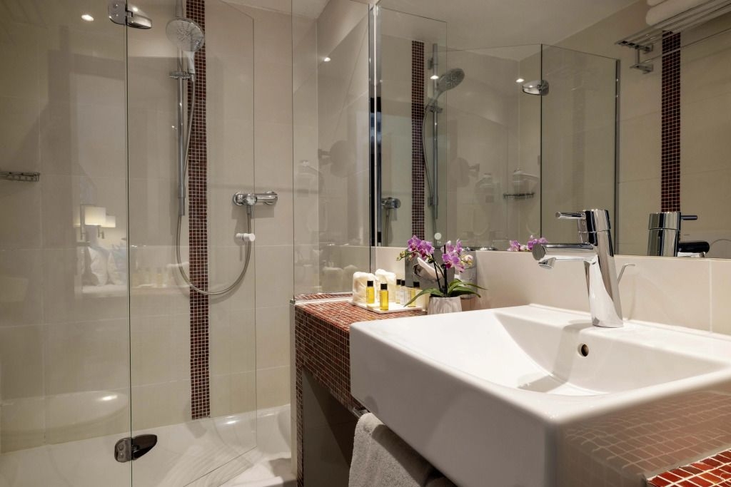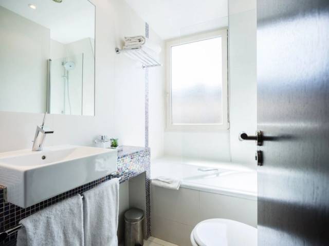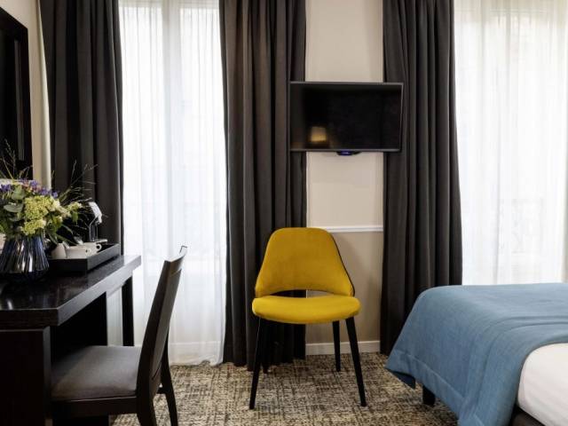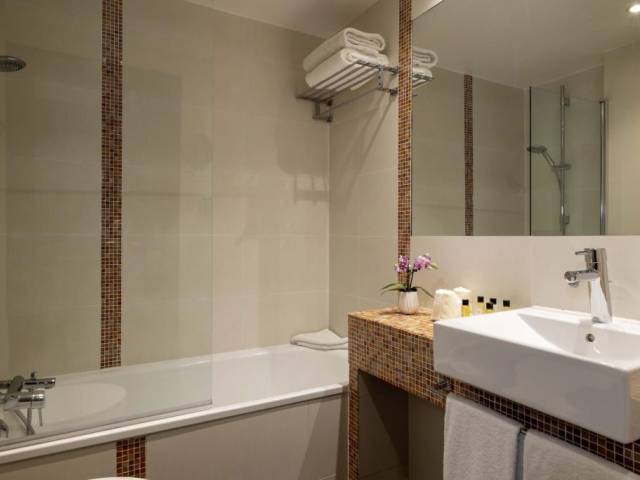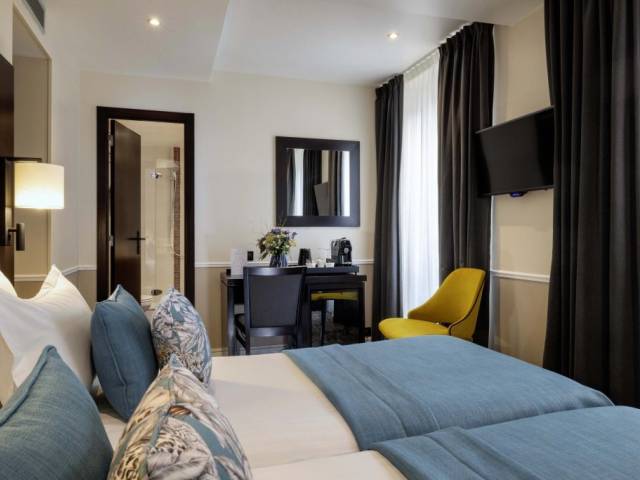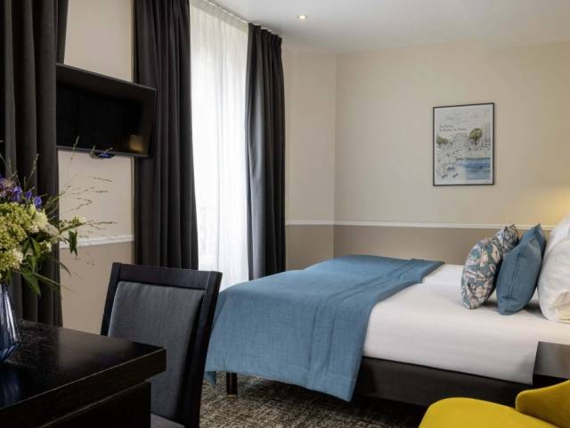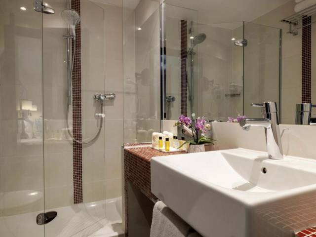La habitación está decorada con calidez y cuenta con todo lo que necesitas para descansar después de un día largo y agitado. Incluye un reloj alarma, una ducha, una TV, un minibar, batas y pantuflas. El equipamiento de la habitación depende de su categoría.