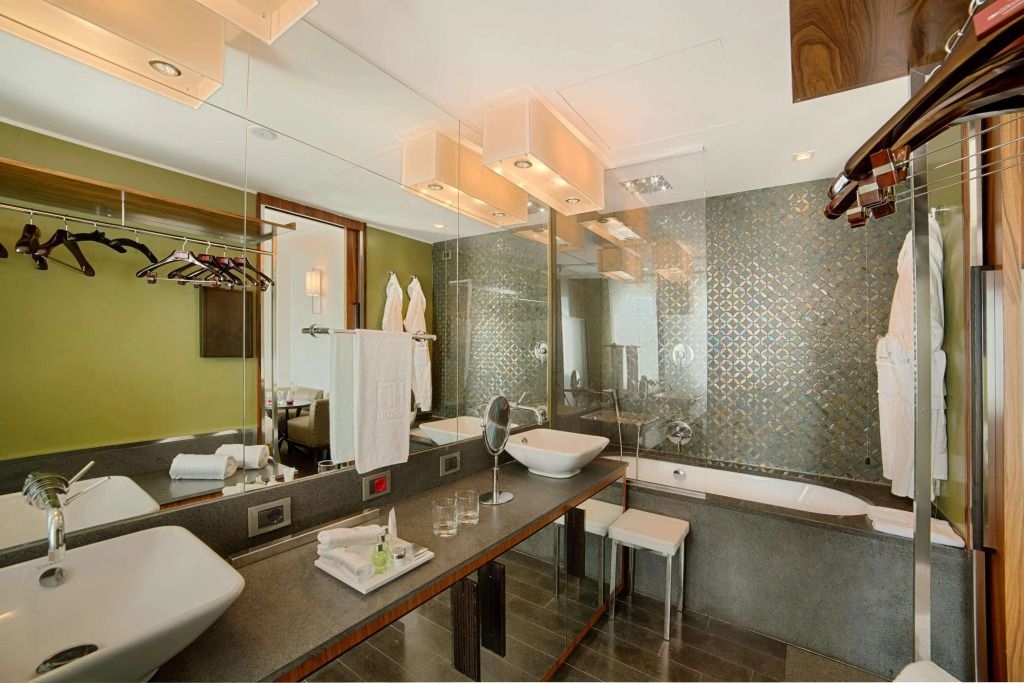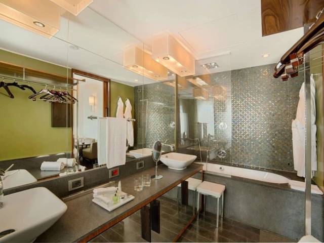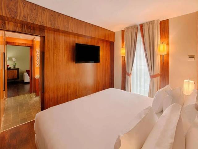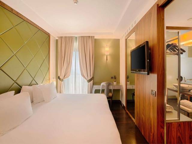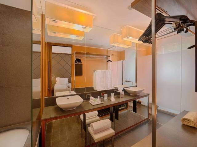 La habitación está decorada con calidez y cuenta con todo lo que necesitas para descansar después de un día largo y agitado. Incluye un reloj alarma, una ducha, una TV, un minibar, batas y pantuflas. Ten en cuenta que no todas las habitaciones incluyen todos los servicios mencionados.