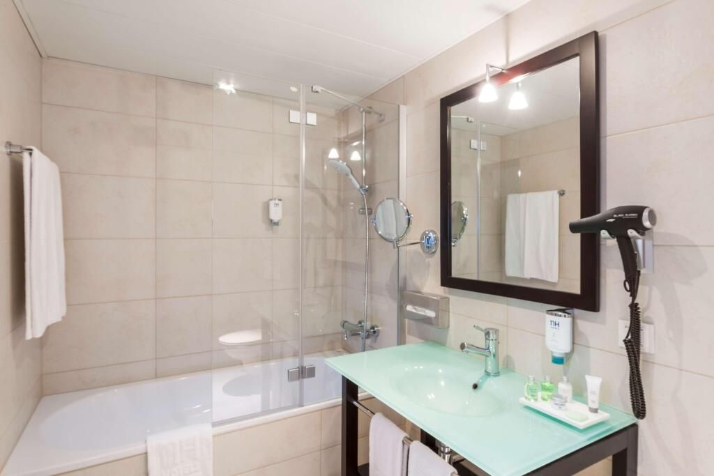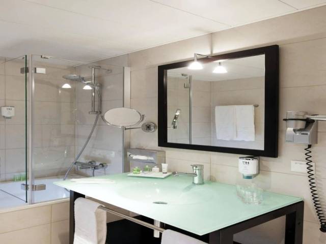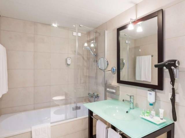 Esto es lo que encontrarás en la habitación para descansar después de un día largo: una ducha, una TV, un minibar y pantuflas. Ten en cuenta que no todas las habitaciones incluyen todos los servicios mencionados.