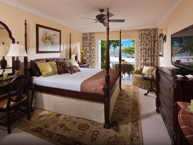 Las elegantes y espaciosas suites del Sandals Montego Bay ofrecen amplias vistas de una de las playas de arena blanca más hermosas de Jamaica y del magnífico mar verde turquesa.