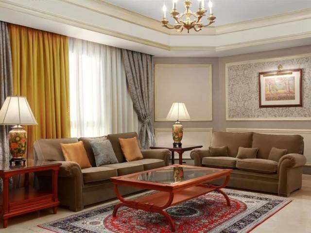 El hotel está estratégicamente situado en el corazón del centro de la ciudad y del moderno distrito de negocios, a sólo 2 km del Centro de Exposiciones, a 3 km del barrio diplomático y a 30 km del Aeropuerto Internacional Rey Jalid.Las habitaciones disponen de TV por cable/satélite, cafetera/tetera, secador de pelo.El hotel cuenta con dos restaurantes. La Piazza sirve comida italiana y Bustan sirve comida árabe.Elegantemente elaborado con mármol italiano e incrustaciones islámicas, cada faceta del diseño de los hoteles ha sido imaginativamente creada para complementar la arquitectura y la atmósfera de esta próspera ciudad.El diseño interior es majestuoso, moderno y clásico.El hotel también incluye plantas VIP, tiendas y comercios, Spa o sauna y servicios de negocios. RD06/08Sólo para reservas dinámicas: Tenga en cuenta que si la tarifa incluye el desayuno, éste sólo se proporcionará para un número máximo de 2 huéspedes, independientemente del número de huéspedes confirmados para la habitación. Los huéspedes adicionales deberán pagar el desayuno directamente en el hotel. Si la reserva es para 3 o más personas, se cobrará un suplemento no incluido en la tarifa, que deberá abonarse directamente en el hotel a la llegada.