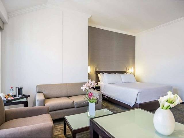 A pocos pasos del distrito financiero, del World Trade Center y de algunos de los mejores restaurantes de la zona, el hotel NH Collection Quito Royal tiene una ubicación ideal tanto para quienes viajan por negocios como por turismo. Situado a 15 minutos del centro histórico de Quito, en el hotel se dan cita las instalaciones más modernas y el mejor servicio personalizado. Las 112 habitaciones del hotel están decoradas en tonos suaves y amuebladas en estilo moderno. Muchas de ellas disfrutan de una vista de la ciudad donde se contemplan las montañas que la rodean y el Panecillo. Nuestro restaurante ofrece una excelente cocina internacional a la carta para el almuerzo y la cena. Y el desayuno buffet cuenta con más de 50 opciones para elegir. El bar del hotel es magnífico para relajarse al final del día disfrutando de una cerveza o una copa de vino. *10% tasa de servicio incluido en el precio.